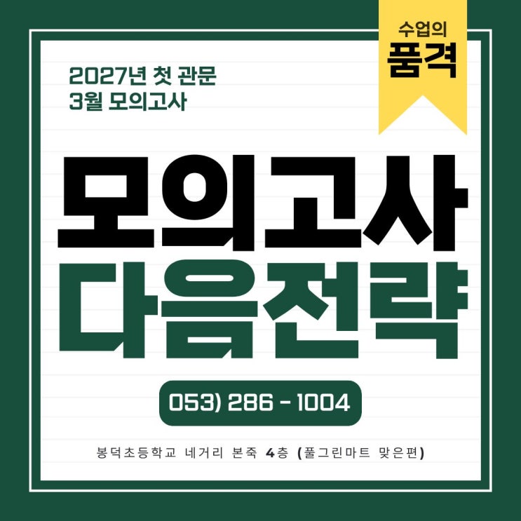 안녕하세요! 수험생의 꿈을 품어주는 곳 대구 봉덕동 영어·수학학원 수업의품격학원입니다. 최근 입시 소식 중 하나가 바로 3월 모의고사 아닐까 싶은데요! 2027 대입 첫 모의고사를 푼 학생들께 고생함을 전하고 오늘은 3월 모의고사에 대해, 다음 모의고사 준비에 대해 이야기 해보겠습니다! 수업의 품격에서 모의고사 짚어 드릴게요 ✅ 3월 모의고사 요약 2027학년도 수능을 향한 첫 관문인 3월 학력평가는 현재 실력을 점검하고 학습 전략을 수정하는 ‘출발점’입니다. 단순한 성적보다 수능 대비 리허설로 활용하는 것이 중요! 1️⃣ 3월 모의고사의 의미 겨울방학 학습 성과를 확인하는 첫 객관적 평가 수능과 동일한 시험 구조....... <img src="https://blogthumb.pstatic.net/MjAyNjAzMjBfMTk0/MDAxNzczOTg0NTYzMTgz.gvgs2BQNL7uUQe0wdMTxVNY50V6zQ-c47FBfxCp9afEg.SSwCOJevX0CPexrsprSl1NhEu4jadcCUd0-UtrsEEv4g.JPEG/%C1%A6%B8%F1%C0%BB_%C0%D4%B7%C2%C7%D8%C1%D6%BC%BC%BF%E4._%282%29.jpg?type=s3" />