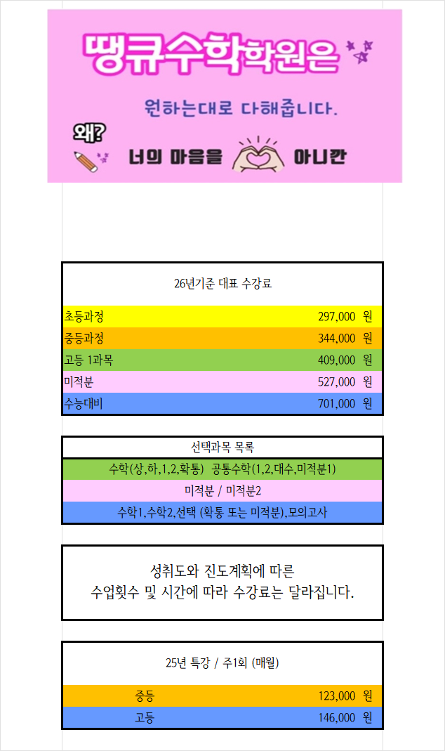 땡큐수학학원 수강료안내(26년1월~)
