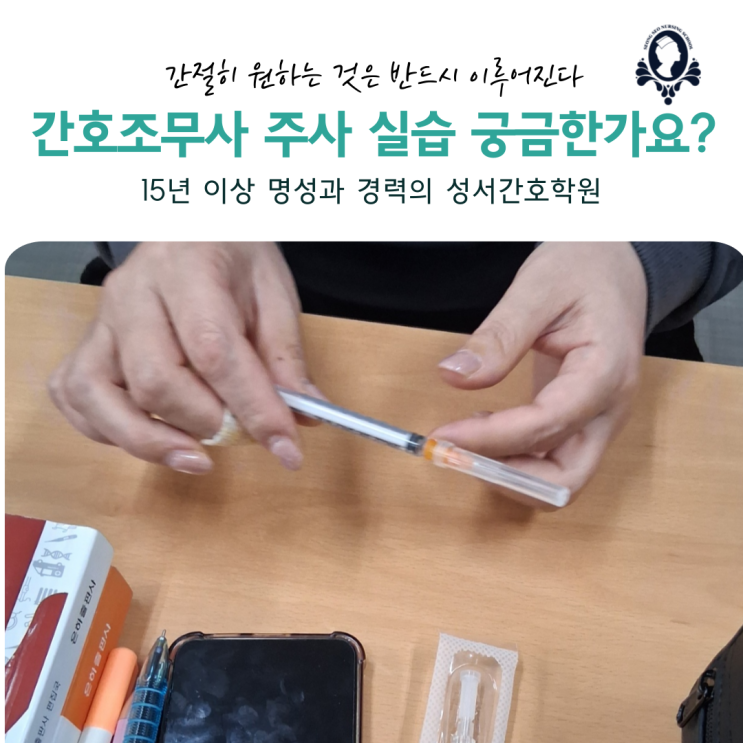 안녕하세요. 성서간호학원 원장 김정애입니다. “실습은 실제로 어떻게 진행되나요?” “주사 같은 것도 직접 해보나요?” “이론만 배우고 끝나는 건 아니죠?” 이 질문이 나오는 이유는 당연합니다. 간호조무사라는 직업은 자격증 시험만 통과한다고 끝나는 일이 아니라 병원 현장에서 실제 업무를 수행 해야 하는 직업이기 때문이죠. 그래서 간호조무사 과정을 고민하는 분들이라면 한 번쯤 “자격증 따고 병원에 가서 아무것도 못하면 어떡하지?”이런 생각을 하게 됩니다. 그래서 성서간호학원에서는 이론 수업만으로 끝나는 교육이 아니라 실제 병원 업무를 이해할 수 있는 실습 교육을 중요하게 생각하며 교육에 임하고 있답니다. 주사기....... <img src="https://blogthumb.pstatic.net/MjAyNjAzMDlfNjYg/MDAxNzczMDM4MTk2MTM5.ly0ykIdvN1yM_76CM3HDF3Pgy-LRoDXVJg6PRYP4NCgg.yD1XxIEFTl81G7MNIlkW3MHdRQ7VRqQUvBlrja1GLPIg.PNG/%C1%A6%B8%F1%C0%BB-%C0%D4%B7%C2%C7%D8%C1%D6%BC%BC%BF%E4_-001_%2868%29.png?type=s3" />