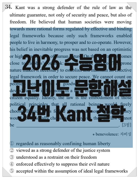 안녕하세요 리드앤톡 영어 하늘도시 스타타워1센터 원장 Robin입니다. 이번 2026학년도 대학수학능력시험 영어영역은 난이도가 높았다고 합니다. 리드앤톡 대표칼럼을 통해서 그 중 추상적인 내용을 다룬 34번 문항의 특징을 살펴보고, 왜 이 시점에서 우리 아이들이 원서 읽기와 구문문석이 철저하게 이루어져야 하는지 살펴 보겠습니다. 아래는 34번 문항 전문입니다. 구문분석과 해설을 첨부합니다. Kant was a strong defender of the rule of law as the ultimate guarantee, not only of security and peace, but also of freedom. He believed that human societies were moving towards more rational forms regulated by effective and ....... <img src="https://blogthumb.pstatic.net/MjAyNTEyMDFfMjgg/MDAxNzY0NTk0OTk3OTYz.ZUuOIaZlaPnm7xxeh77ZStlxwegX-gazW8aZq4T0PnEg.r_jEuuOm0CRMw96NKSg7HhqubQJP0D9XuU975etHbl0g.PNG/image.png?type=s3" />
