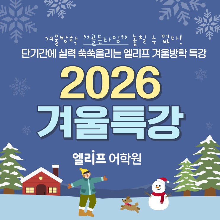 [2026 엘리프 어학원 겨울방학 특강 안내] 겨울방학 “골든타임” 놓치지 마세요! 겨울방학 알차게 보내는 최고의 방법! 단기간에 실력 쑥쑥 올리는 엘리프 어학원의 2026 겨울특강이 시작됩니다~! 1. 스피킹 & 영어원서 1월 19일 ~ 1월 29일 매주 월요일~목요일 2시 10분 ~3시 (총 8회) 대상 : 초2~5학년 스피킹에 흥미가 있는 친구 누구나 학습내용: 디즈니 영화로 배우는 원어민 표현 + 원서 독해 사고력 강화 디즈니 애니메이션 대사로 원어민 표현을 재미있게 익히는 스피킹 훈련 영어 원서 읽기 후 내용을 토론하며 자신의 생각을 정리하는 사고력 훈련 말하기와 읽기를 동시에 향상시킬 수 있는 융합 수업 2. 예비중 독해특강 1월 19일....... <img src="https://blogthumb.pstatic.net/MjAyNTEyMDhfMjEg/MDAxNzY1MTc5OTM2ODU3.TbzDxc6ZlvQjKF7GszEYkUu68jXZ7Vvqd3fz7nxchaYg.1ISWXlJBF7ZB8ZUIn403nNZ4kIDZdJOYal5l8-7EAkIg.JPEG/001.jpg?type=s3" />