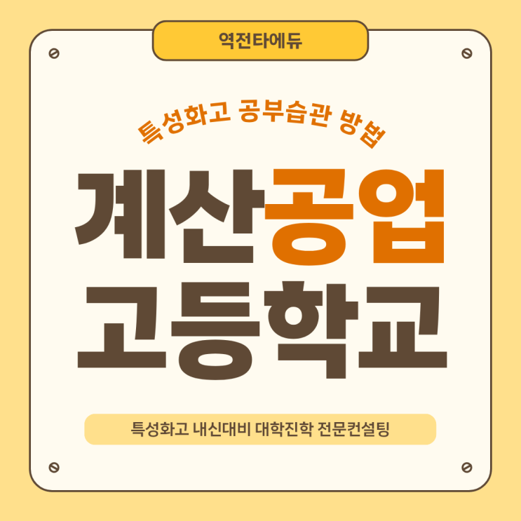 안녕하세요, 이번 포스팅에선 요즘 많이 궁금해하시는 계산공업고등학교 입학 전 무엇을 준비해야하는지와 특성화고 학생의 내신대비 방법에 대하여 역전타에듀가 정확하게 안내드리겠습니다! ⚙️ 계산공고는 전기·전자·It 등 공학계열의 학과를 운영하는 남학교 공업계 특성화고입니다. 교실보다 현장을 추구하는 실무형 기술 인재 양성에 집중되어 있으며, 중소기업 특성화고 인력양성사업 대상학교 선정될 만큼 신뢰도 있는 교육과정을 가지고 있어요. [주요 특징] ✏️전공 실습 중심 수업 비율 높음 ✏️기계·전기·전자 기능사 등 자격증 교육 운영 ✏️공업계열 산업체 취업 연계 프로그램 강화 ✏️공대 및 특성화대....... <img src="https://blogthumb.pstatic.net/MjAyNTEyMDlfMjcg/MDAxNzY1MjQwNjAwNzg1.9rrITJ33_FIh36wHC-2a9cBTGFUhdgHzVbwZa0ovh8Ug.j9Mg9hMsL1DVHHqqbl3TzaaReIswqpEpBWp2VMSxrRsg.PNG/%C1%A6%B8%F1%C0%BB_%C0%D4%B7%C2%C7%D8%C1%D6%BC%BC%BF%E4_%2826%29.png?type=s3" />