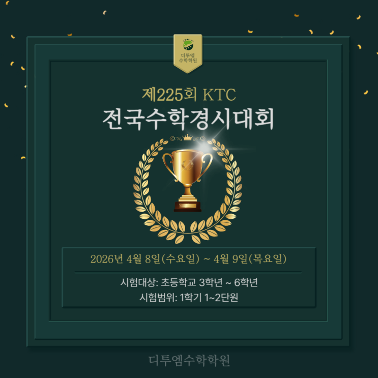 2026년, 디투엠(DTOM)이 고려대 KUT를 도입한 이유 그동안 디투엠수학학원은 내부적으로 KTC 전국 수학경시대회를 꾸준히 실시하며 새봄초, 박문초, 인성초 다니는 우리 아이들의 실력을 꾸준희 점검해 왔습니다. 하지만 25년 차 교육 전문가로서 늘 고민해온 지점이 있었습니다. "우리 아이들이 학원이라는 울타리를 넘어, 전국 단위에서 자신의 실력을 객관적으로 확인하고 압도적인 성취감을 맛볼 방법은 없을까?" 이 고민 끝에, 2026년 올해부터 공신력 있는 고려대학교 KUT 전국 수학 학력평가를 정식으로 도입하기로 했습니다. 단순히 시험 횟수를 늘리는 것이 아닙니다. 아이들에게는 '나도 할 수 있다'는 강력한 동....... <img src="https://blogthumb.pstatic.net/MjAyNjA0MDJfNDkg/MDAxNzc1MDg1ODY3NjE2.VZRnJmueXjEdnsZsyAdKlERs5OMl89n8DWM6NsmqcFkg.g-tQ6XWrgg0vSizCPVOK95qoR1ixtpUSCiSeiwltsR8g.PNG/KTC_%BC%F6%C7%D0%B0%E6%BD%C3%B4%EB%C8%B8-001.png?type=s3" />