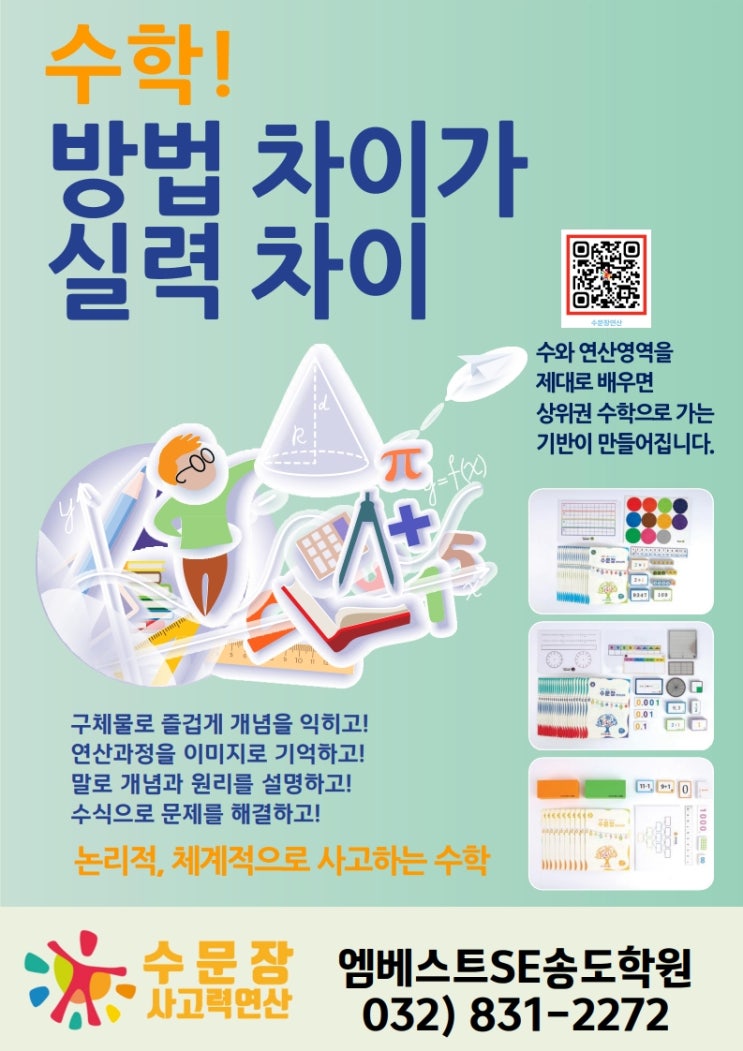 초등수학 탄탄기초! 수문장 연산으로 상위권까지! 안녕하세요~ 초등수학이 걱정되시나요? 수문장 연산/사고력연산으로 개념 → 연산 → 사고력까지 한 번에 잡아드립니다! ✨ 수문장 연산 4단계 학습 구체물로 개념 익히기 재미있는 물건으로 원리 이해! 이미지로 연산 기억 그림처럼 머릿속에 새기기! 말로 설명 연습 개념을 내 말로 풀어내기! ️ ➕ 수식으로 문제 해결 논리적으로 풀어내기! ✅ ❓ 왜 연산이 핵심일까? 수학 실력 차이는 연산력에서 시작됩니다! ⚡ 초등 개념을 제대로 배우면 중·고등수학까지 쭉 이어집니다. -수학교과서 기반 체계 교재 -개념 간 연결 완벽! ?....... <img src="https://blogthumb.pstatic.net/MjAyNjA0MDRfMyAg/MDAxNzc1MjcxNTQzNzg0.lFflYHtByETsPUxfs3SgX5jceLJSl3wO0ogKNmHA2jog.z58WA1FGh-Dy28vwb0wPHw5YLfWQ3PlQRQ1Nd-pghZog.JPEG/%BC%F6%B9%AE%C0%E5%BC%D2%B0%B3%28%C7%D0%BF%F8%B8%ED%2920160404_2.jpg?type=s3" />