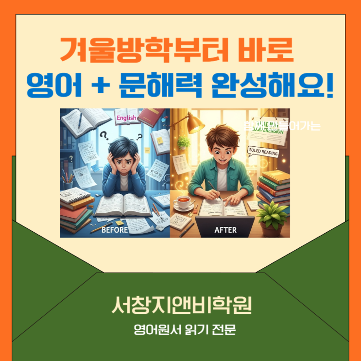 안녕하세요, 서창지앤비학원입니다. 한 해의 끝자락에서 겨울방학을 준비하는 12월이 왔습니다. 학부모님들과 상담하다 보면 비슷한 고민을 많이 들으십니다. 우리 아이 영어 실력이 제자리걸음인 것 같다는 걱정, 문법은 아는데 실전에서 활용을 못 한다는 답답함, 단어를 외워도 금방 잊어버린다는 한숨 같은 것들입니다. 이런 문제들의 해결책은 의외로 간단합니다. 바로 영어원서 읽기입니다. 책을 읽으면서 자연스럽게 영어를 익히는 것이야말로 가장 효과적인 학습법입니다. 이번 겨울방학에 영어원서 읽기로 문해력과 영어를 함께 향상시키는 방법을 소개해 드립니다. 저희 지앤비학원에서는 학생들의 영어실력 향상을 위해서 영어원서 읽....... <img src="https://blogthumb.pstatic.net/MjAyNTEyMDVfNzMg/MDAxNzY0ODk0NDkxMzYx.IMWVkJbolg5NLCAHAbi6j4R11YmAybrZXDO_kO8DCNsg.tQ9flmHrBPkucvFNlTkYDpzBy8Bm54bK_-AdlFc0weAg.PNG/%C1%A6%B8%F1%C0%BB_%C0%D4%B7%C2%C7%D8%C1%D6%BC%BC%BF%E4_-002_%2828%29.png?type=s3" />