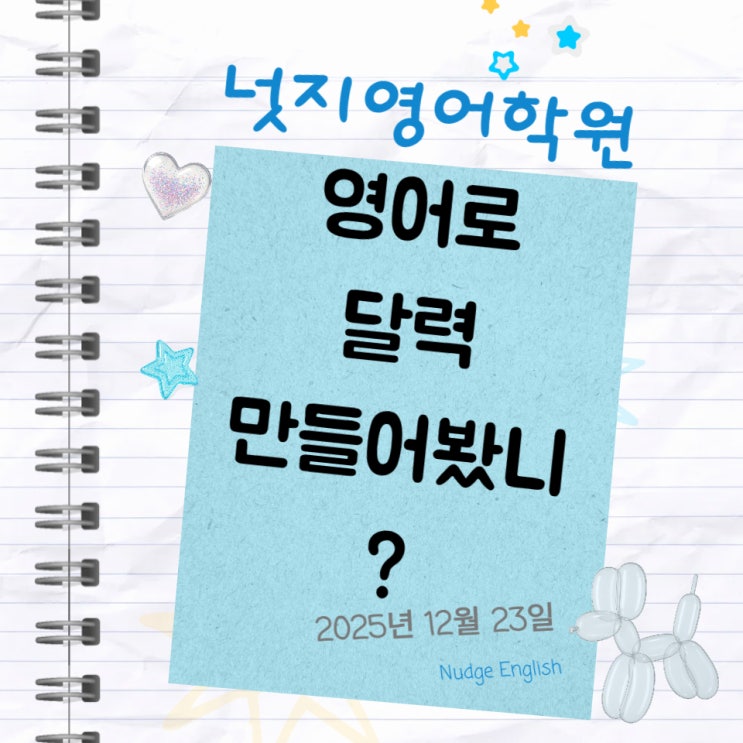 안녕하세요 효성동 영어학원 넛지영어 Joy T입니다! 엄청 추운 날씨가 계속된다고 해요. 한파가 이번 주 내내 지속될 것 같아요. 건강관리 잘 하시어 튼튼한 면역 유지하시기 바랍니다. 너무 오랜만에 인사드려요! 누구나 바쁜 연말연시를 보냈는데요, 효성동 영어학원 넛지영어에서도 많은 행사와 모둠수업, 특강이 있었고 예비 중1과 예비 고1 학생들의 두근두근 학교 발표도 있었던지라 새로운 학습 과정에 적응하는 시기였어요. 우리 효성동 넛지영어학원 친구들의 2026년 새로운 소식들은 하나씩하나씩 나중에 자랑할게요~ 효성동 영어학원 가운데 유일무이한 넛지영어만의 행사! 영어로 달력만들기! 격년으로 크리스마스 직전에 하곤하죠. ....... <img src="https://blogthumb.pstatic.net/MjAyNjAxMTJfMjAx/MDAxNzY4MjEzMzc0MzA3.nq8ET4LF-4jMbFTmPjd2mYXtew5FNrJnvXJA5FSdqDMg.qjFETRgC-Aa3sTjAuDVRFtRdmQVqeTz7upypvbFf1d8g.JPEG/%C1%A6%B8%F1%C0%BB_%C0%D4%B7%C2%C7%D8%C1%D6%BC%BC%BF%E4_-001.jpg?type=s3" />