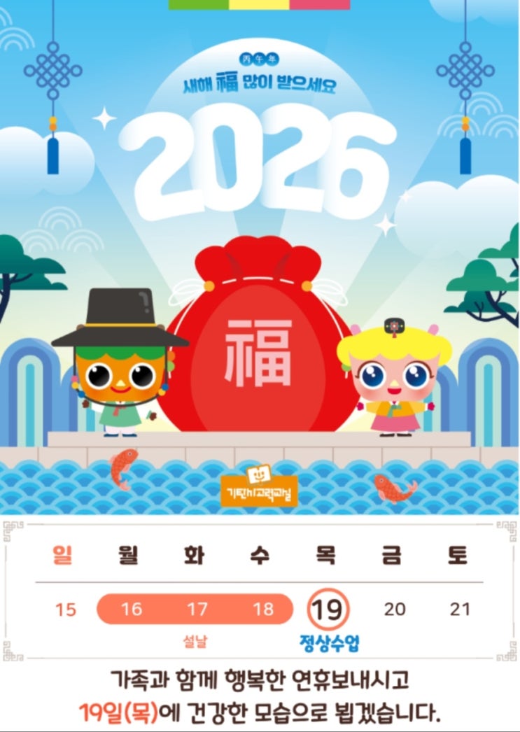 사랑하는 기탄 학부모님께, 2026년 새해가 밝았습니다. 가정에 건강과 행복이 가득하시길 바라며, 새해 복 많이 받으세요. 다가오는 설날 연휴로 인해 아래와 같이 휴원하오니 일정에 참고해주시기 바랍니다. 휴원기간: 2026년 2/16일(월) ~ 18일(수) (3일간) 정상 등원일: 2026년 2월 19일(목) 가족과 함께 따뜻하고 행복한 명절 보내시고, 연휴 후 2월 19일(목) 건강한 모습으로 만나겠습니다. 새해에도 아이들과 함께 즐겁고 안전한 교육활동으로 보답하겠습니다. 새해 복 많이 받으세요~ <img src="https://blogthumb.pstatic.net/MjAyNjAyMTZfNzYg/MDAxNzcxMjI3NjI2MjA1.oUR0mV9HrQylc-ro_MdwzqxsOQ_ue7K9BQ0d16j7IFMg.wXzx9eHN0HLoczK8wC0N746IYCUmPjjAK-ENLedEJ1gg.JPEG/900%A3%DFScreenshot%A3%DF20260216%A3%DF163029%A3%DFNAVER.jpg?type=s3" />