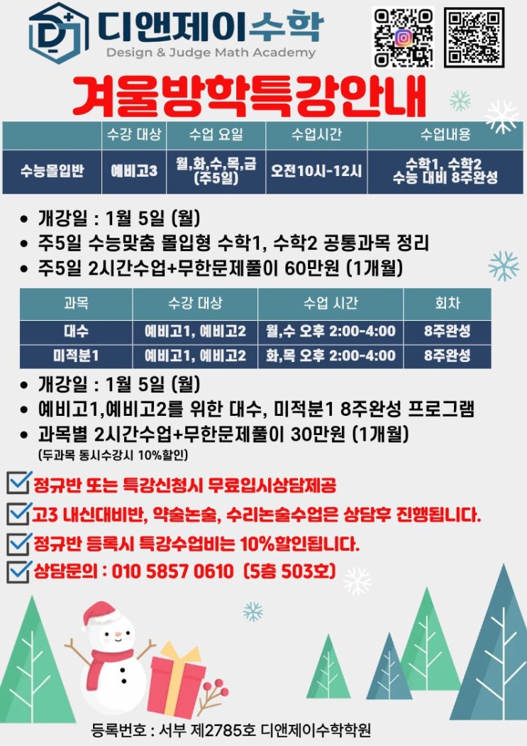 안녕하세요. 디앤제이수학입니다. 2026년 겨울방학특강안내입니다. 디앤제이수학에서는 2026 겨울방학동안 예비고1, 예비고2를 위한 대수, 미적분1 특강과 예비고3을 위한 수능대비반을 오픈합니다. 각각 8주 완성을 목표로 진행되며 내신대비반은 특강과는 별도로 개별진도로 운영됩니다. 또한 수리논술, 약술논술반은 상담후 수업이 진행됩니다. 자세한 상담과 등록문의는 010 5857 0610 으로 문자나 전화주시면됩니다. 등록번호 서부 제2785호 디앤제이수학학원 <img src="https://blogthumb.pstatic.net/MjAyNTEyMDhfODYg/MDAxNzY1MTczMjk0NDE4.mP3Q5Z-q9n0UApxbK0Q-8hhF_FnTi-cs9JoZQGk7bOkg.m5Ux_rbODeeGA6Ij5y1Np7JkdxQsc8m3YiiX1e9rNYkg.JPEG/%B0%DC%BF%EF%B9%E6%C7%D0%C6%AF%B0%AD_%281%29.jpg?type=s3" />