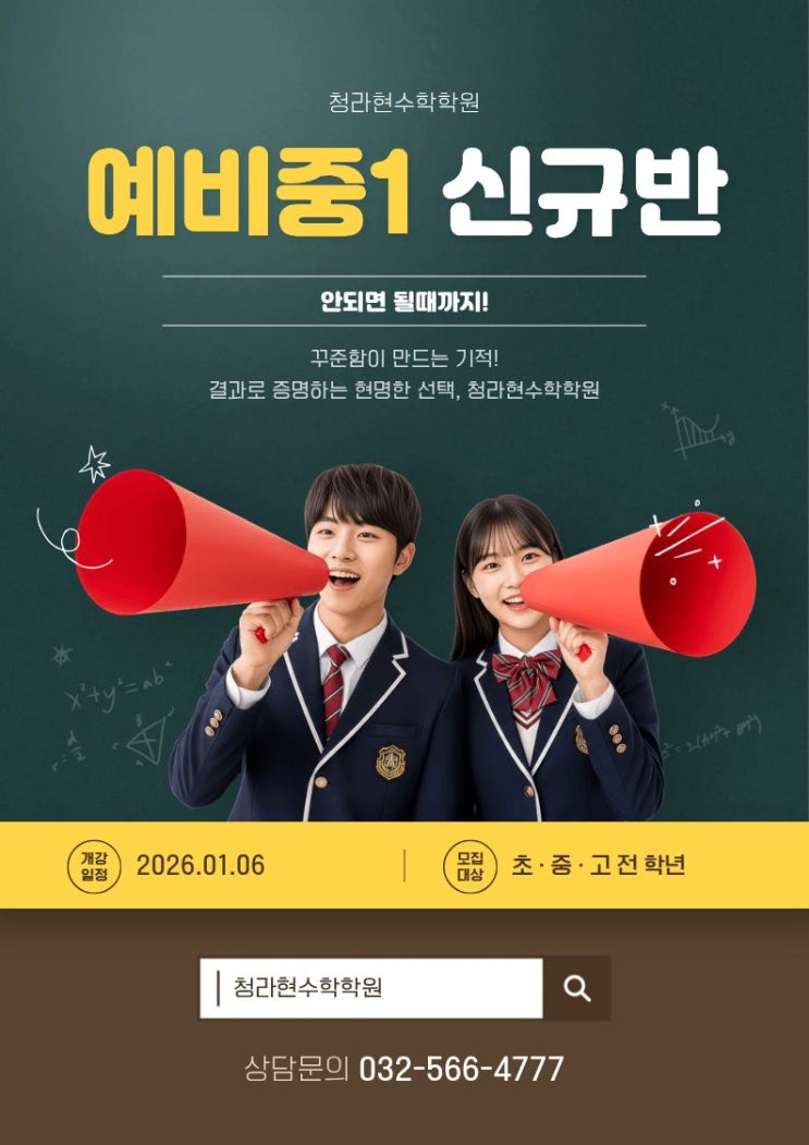 안녕하세요 청라 5단지 수학전문학원 청라현수학학원입니다. 올 한해 첫 새해인사를 드린게 어제 같은데 벌써 한 해의 끝인 12월을 달리고 있습니다. 추워진 날씨에 청라 맹모님들 감기 조심하시고, 얼마 남지 않은 2025년도 한 해 잘 마무리 되시길 바랍니다. 청라현수학학원에서도 2025 마지막 시험을 위해 최선을 다하고 있는 요즘입니다. 그리고 이 시기가 되면 늘 그랬듯이 내년 중학교 입학을 앞두고 첫 내신시험을 치르게 될 아이들을 걱정하는 학부모님들의 상담,문의전화로 바쁜 하루하루를 보내고 있습니다. 중등 과정이 시작되면서 아이들이 어려워하는 개념들과 쉽지 않아지고 있는 학교별 시험들로 걱정이 많으심을 충분히 알고 있....... <img src="https://blogthumb.pstatic.net/MjAyNTEyMDlfMTU3/MDAxNzY1MjY1MjA1Njgx.Qrt8Z_dh5IWxIwYcUuUPxHR5ECzJo12s4AfaY9eIH0Ug.IWdgCfACayzCQZT53ZAM9oaFWlIP2lC8Tw3cdSznmY4g.JPEG/%BF%B9%BA%F1%C1%DF1_%BD%C5%B1%D4%B9%DD.jpg?type=s3" />