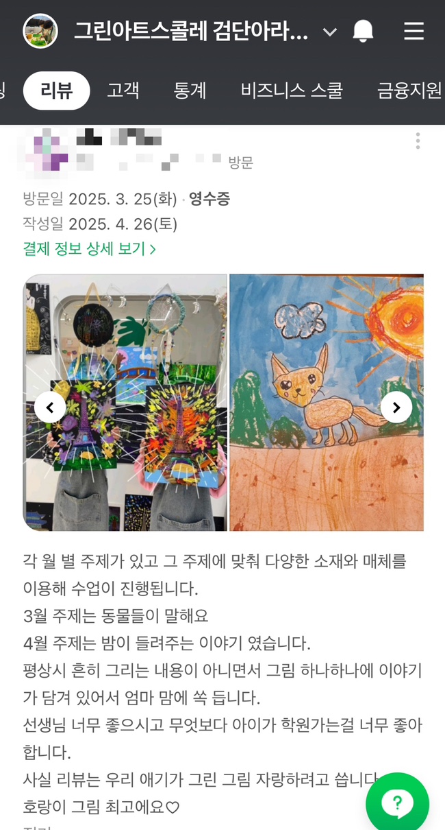 안녕하세요! 검단신도시, 아라역 미술학원 아동미술 그린아트스콜레 검단 아라교육원 입니다. 아이들 미술학원을 선택하실 때 가장 먼저 확인하시는 것! 요즘은 바로 네이버 플레이스 리뷰라는 것을 잘 알고 있습니다. 그래서인지 요즘 플레이스 리뷰를 만들어 준다는 마케팅 회사의 전화를 많이 받곤 합니다 실제로 이용허지 않은 이용자가 남긴 리뷰가 많은 학원, 관연 믿을 수 있을까요? 그래서 저희는 많지는 않지만, 실제로 재원중인 학부모들께서 남겨주시는 솔직한 후기만을 소중하게 담고 있습니다. 학부모님이 남겨주신 리뷰들은 저희가 운영을 잘하고 있는지 돌아보는 중요한 기준이자, 처음 방문하시는 분들에게는 신뢰를 드릴 수....... <img src="https://blogthumb.pstatic.net/MjAyNTExMjFfMjc3/MDAxNzYzNzA5OTY3OTk5.ndBR1JpUt913fqv_LDdXuM4sXGRokwgucFkJpB_sSBsg.hPdEgV8VeNK1zxeR4g-6HEkQMDH16vbs-ISWdAcywrEg.JPEG/output%A3%DF4255302644.jpg?type=s3" />