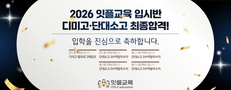 2026 잇플교육 영수코 입시반 디미고·단대소고 최종합격 소식을 전합니다! 올 한 해 동안 정말 치열하게! 꾸준하게! 준비해온 우리 입시반 학생들의 기쁜 소식을 전합니다! 잇플교육은 영수코 통합반을 운영하며 2026학년도 디미고1명, 단대소고 4명 합격의 놀라운 결과를 만들었습니다. 잇플교육 입시반이란? 디미고, 단대소고 입시를 준비하는 예비중 3 학생을 위한 잇플교육의 코딩·수학·영어 통합 입시 집중반 입니다. 잇플교육 입시반만의 특징은? ☑ 의미있게 보내는 중3 1년 입시 로드맵! 영어, 수학 교과 진도부터 C언어 실기 시험 정보올림피아드(KOI)대회 준비까지 계획적으로 완성 ☑ 교과, 실기, 면접을 모두 아우리는 종합 대비 시....... <img src="https://blogthumb.pstatic.net/MjAyNTExMjhfOTkg/MDAxNzY0MzE4ODM5Nzkx.c5AEugLhTlwT9miGlStXRtSNO0iRg16HciRg_ukuvbsg.Mktx3WPCZTQV3xfcy2ZrputVM3-FAyQjxPQKBqrPE80g.JPEG/%C1%A6%B8%F1%C0%BB_%C0%D4%B7%C2%C7%CF%BC%BC%BF%E4_-_2025-11-27T131808.562.jpg?type=s3" />