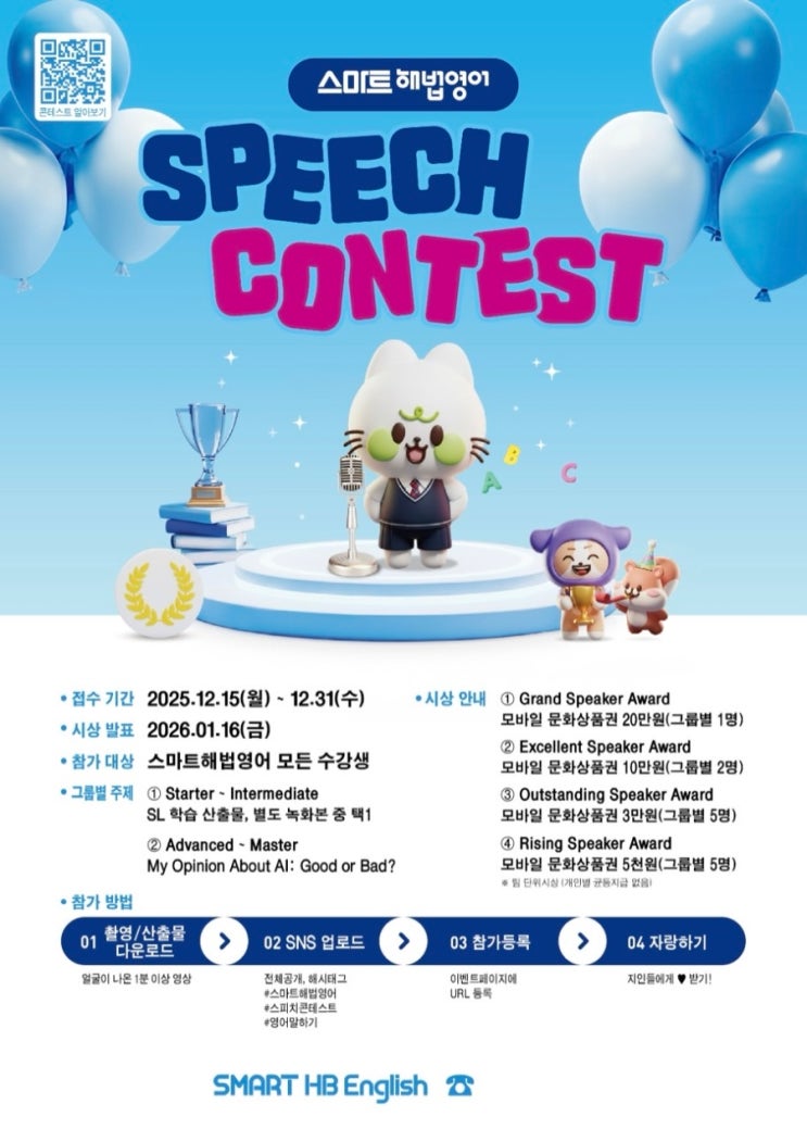 안녕하십니까, 동대문구 이문동 이문초등학교 앞에 위치한 초·중등 영어, 수학 전문 학원 이문해법학원입니다. 이문해법학원에서는 스마트해법영어 본사 주최로 진행되는 2025년 겨울, 특별한 이벤트인 SPEECH CONTEST의 참가자를 모집합니다! 아이들이 그동안 갈고닦은 영어 실력과 자신감을 마음껏 펼쳐 보일 수 있는 절호의 기회입니다. 스마트해법영어 SPEECH CONTEST, 왜 참가해야 할까요? 이번 콘테스트는 단순한 경쟁이 아니라, 아이들이 자신의 생각을 영어로 구성하고 발표하는 과정을 통해 자기 주도 학습 능력과 유창성을 한 단계 끌어올리는 귀중한 경험이 될 것입니다. 게다가 우수한 참가자에게는 총 40명에게 푸짐한 시상이....... <img src="https://blogthumb.pstatic.net/MjAyNTEyMDFfMTc0/MDAxNzY0NTc1MDIyODk1.Vt0g6QhxG5U5PNY3yConzoeCWBgECWdAp0b0AOt3xFkg.GawRXgVey2H06lMS9216HAsUpcY_blfkYfo49h4VoScg.JPEG/900%A3%DF1764573678132.jpg?type=s3" />