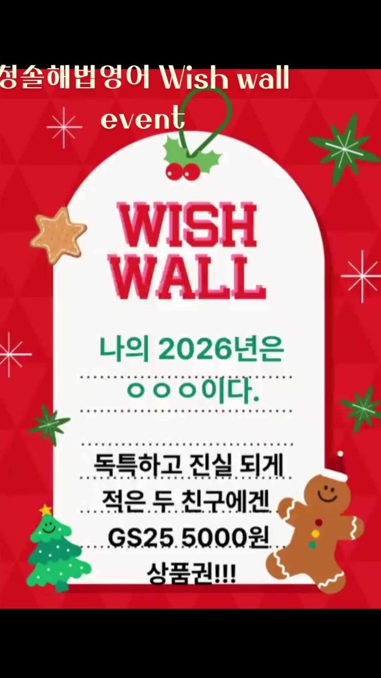 소원을 말해봐~~ 내게만 말해봐~~~ 청솔해법영어 클스마스 이벤트 하나 !!! wish wall 만들기 나의 2026년은 oo 이다 번뜩이거나 또는 감동적이거나 또는 건설적인 ooo 두개를 뽑아 선물 증정 !!! 멋진 2026년의 wish 적어 보세용~~~ 기간 12/3 ~ 12/24 발표 12 / 26일 ( 금 ) 이벤트 둘!! 맵단 떢볶이 ~ 뜨끈한 어묵 파뤼!!!♡♡ 우리 친구들이 기다리고 기다리던 원장님표 떡볶이와 함께 친구들의 wish를 함께 읽어보아요~~^^ 상담문의 02 2248 0509 #클스마스 #wish # wall #떡볶이 <img src="https://phinf.pstatic.net/image.nmv/blog_2025_12_06_3435/o566ehTqZY_03.jpg?type=f480x480" />
