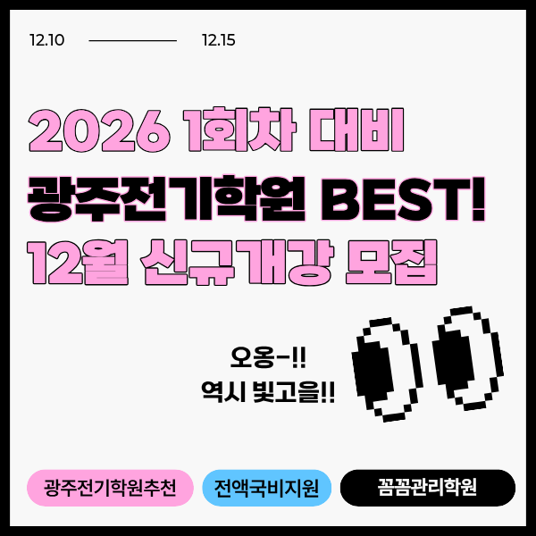 광주에서 전기기사·전기산업기사 필기 준비를 계획 중이시라면, 지금이 가장 좋은 기회입니다. 빛고을전기학원에서 12월 신규 과정이 오픈되며, 일부 과정은 "전액 국비지원으로 수강"하실 수 있습니다. 광주 지역에서, “광주전기학원, 광주 국비지원 전기학원, 광주 전기기사 학원” 등을 찾고 계셨다면 이번 글이 딱 맞는 정보가 될 거예요. ✔ 12월 개강 과정 안내 1. 야간반 – 회로이론 + 제어 · 전기설비 과정 개강일 : 12월 10일(수) 시간 : 19시 ~ 22시 (3시간) 전기기사 필기 과목 중 가장 난이도 높은 ‘회로이론’, 그리고 실기까지 연결되는 전기설비 과목을 함께 다룹니다. 직장인도 부담 없이 참여 가....... <img src="https://blogthumb.pstatic.net/MjAyNTEyMDNfMjY0/MDAxNzY0NzQ0NDA5Mjk1.fE6B2mzKcVysCLYiadcVm1abpxTBEW_XpMzLHFsRtakg.B1mfF73pl2nqeTzxUYKqA_-CIpHhA-wA8lr7UTzY5Hog.PNG/%C1%A6%B8%F1%C0%BB_%C0%D4%B7%C2%C7%D8%C1%D6%BC%BC%BF%E4._%281%29.png?type=s3" />