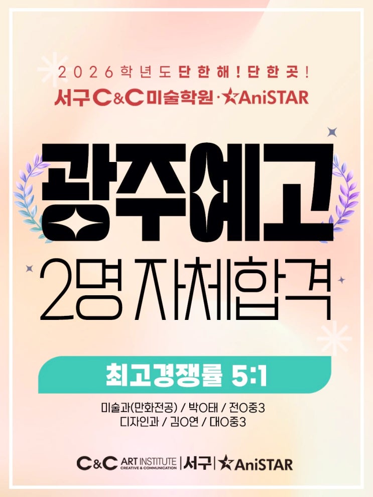 안녕하세요! 광주 서구 씨앤씨 미술학원입니다~ 어느덧 12월에 접어들었는데요~ 남은 12월동안 고생한 한 해를 잘 마무리하시길 바랍니다~ 저희 광주 서구 씨앤씨 미술학원은 2026학년도 수시 합격 소식에 이어 오늘은 또 다른 합격 소식을 들고 왔는데요~ 2026학년도 광주예술고등학교 만화과, 디자인과 자체 합격! 영광의 주인공들 함께 보실까요? 합격을 축하합니다! 앞으로도 꿈을 위해 열심히 달려나갈 수 있도록 저희 광주 서구 씨앤씨 미술학원이 응원하며 최선을 다해 지도하겠습니다~ 어린 나이지만 그래도 꿈을 향해 열심히 달려나가며 준비하는 친구들이 많은데요~ 더욱더 자랑스럽고 축하 가득한 마음입니다~ 광주 예고 만화과는 5년....... <img src="https://blogthumb.pstatic.net/MjAyNTEyMDVfMjU1/MDAxNzY0OTMyMTkyNzgy._TFxpScNKY_7paZ4eMqUgZay8gq4ldWsqjxNiXlEZOwg.WvriH1BIaVep2yITX4dMKVw9HrpZWXm344xtjG86cMEg.JPEG/%BC%AD%B1%B8CC_%C0%A5.%C1%A6%C0%DB%B9%EA%B5%E5_%BB%E7%C1%F8_20251127_1.jpg?type=s3" />