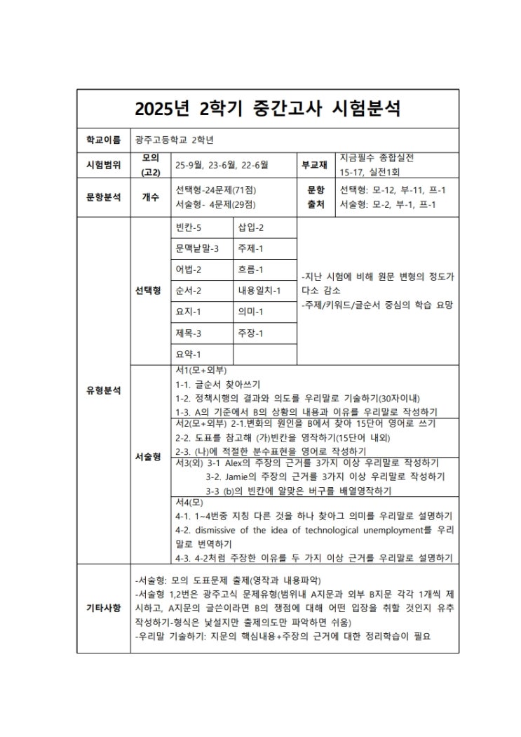 안녕하세요? 봉선동 에듀진 영어학원 Tony 원장입니다. 광주고 2학년 2학기 영어 중간고사 시험분석(2025년)한 내용을 게시하겠습니다. 고득점을 위해 다양한 변형문제를 접하는 것도 중요하지만, 오답 정리를 통해서 자신을 실력을 쌓아가는 방법을 터특해야 합니다. 광주고 이번 내신 특징은 아래와 같으며 고득점을 위해서는 아래와 같이 준비해야 합니다. -서술형: 모의 도표문제 출제(영작과 내용파악 중요) -서술형 1,2번은 광주고식 문제유형(범위내 A지문과 외부 B지문 각각 1개씩 제시하고, A지문의 글쓴이라면 B의 쟁점에 대해 어떤 입장을 취할 것인지 유추 작성하기-형식은 낯설지만 출제의도만 파악하면 쉬움) -우리말 기술하기: 지....... <img src="https://blogthumb.pstatic.net/MjAyNTExMjhfMTAw/MDAxNzY0MzExMTgxMzY4.t1OG14rXLRqeODEYT0UVg1AABUh43fMgZ83XV-B6S9og.ryRJxxbzUqwsX0ubTOWoE6BvmiQBAfmAvY9FLMj1e74g.JPEG/25-2-%C1%DF%B0%A3_%B1%A4%C1%D6%B0%ED2_1.jpg?type=s3" />