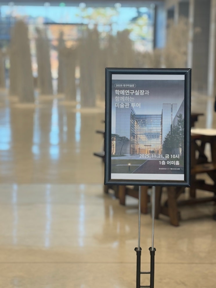 학예연구실장과 함께하는 미술관 투어 다녀왔어요! 미술관에서 학예연구실장님을 만나는건 꽤나 생소한 일인데 학예연구실장은 미술관 전시기획 및 소장품 및 아카이브 관리와 연구수행등을 하는 미술관의 전반적인 일을 책임지는 분이라고 해요 대구미술관을 굉장히 자주 왔었는데 아카이브실은 처음 와보네요 연도별 도록을 관람할 수 있고 아티스트 박스를 열람할수 있는것도 흥미로웠어요 처음 미술관을 지을때 다양한 공간을 기획해서 지었다면 훨씬 더 멋지게 활용할수 있었을텐데 협소한 공간을 최대한 활용하려다보니 다양한 기획을 추진하기가 어려운게 아쉽다는것이 학예연구실장님의 설명이었어요. 현재 전시중인 이강소님과 허윤희님....... <img src="https://blogthumb.pstatic.net/MjAyNTExMjdfMjQ1/MDAxNzY0MjE1NTI1OTQy.MEIZCEaa_kP7LJujN1oFEJUbPancWrA1-z-3okn988Mg.fJsxwpKEu3eZh26Kkyz0M-On3BXPiyuHAmSpylH9p0wg.JPEG/IMG_7475.JPG?type=s3" />