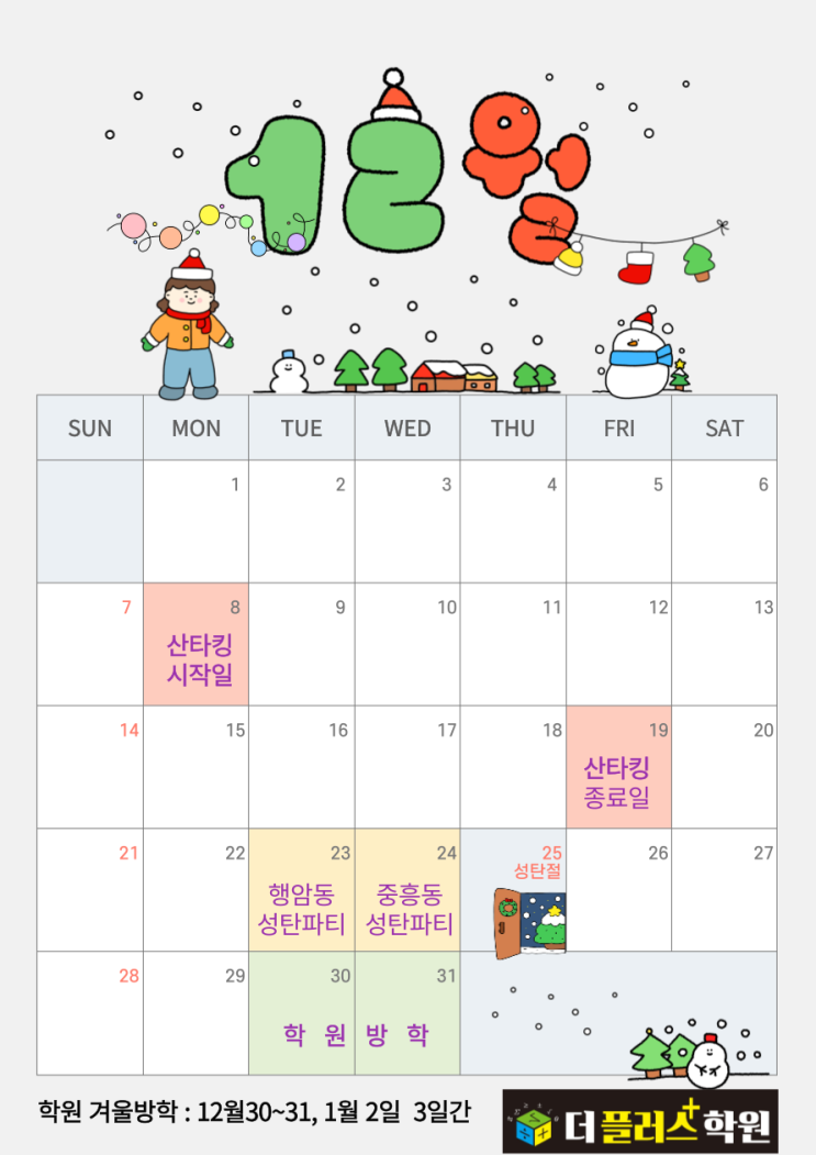 우리 아이의 가능성, 생각하는 힘을 키우는 곳에서 시작됩니다. 개념을 이해하고, 질문을 던지고, 스스로 풀어내는 수업을 통해 우리 아이의 확실한 성장을 이끌어내는 학원, 수학에 문해력을 더하는 진짜 공부를 함께하는 더플러스학원입니다. 12월 학사 일정 안내드립니다~! 12월은 아이들도, 학원도 가장 바쁘고 즐거운 달이에요^^ 올해는 예년처럼 성탄파티도 준비되어 있고, 아이들이 한 해 동안 열심히 노력한 만큼 따뜻하게 마무리할 수 있도록 활기찬 일정이 가득합니다. ✔ 12월 주요 일정 12/8(월)~ 12/19(금) 산타킹 이벤트 기간 12/22(월) 행암동 성탄파티 12/23(화) 중흥동 성탄파티 12/25(목) 성탄절 휴원 12/30~31, 1/2....... <img src="https://blogthumb.pstatic.net/MjAyNTEyMDFfMjA1/MDAxNzY0NTE0ODMyNzg0.hDkBVoGrYsOVQqgMRAoU_mcfMrDo5V_WbNUeZrrjMvUg.vD1esTWL4Emqr4Ojv5_6H-yoXpaGM4xAbQ9YXlxgpPAg.PNG/%C4%B6%B8%B0%B4%F5-003.png?type=s3" />