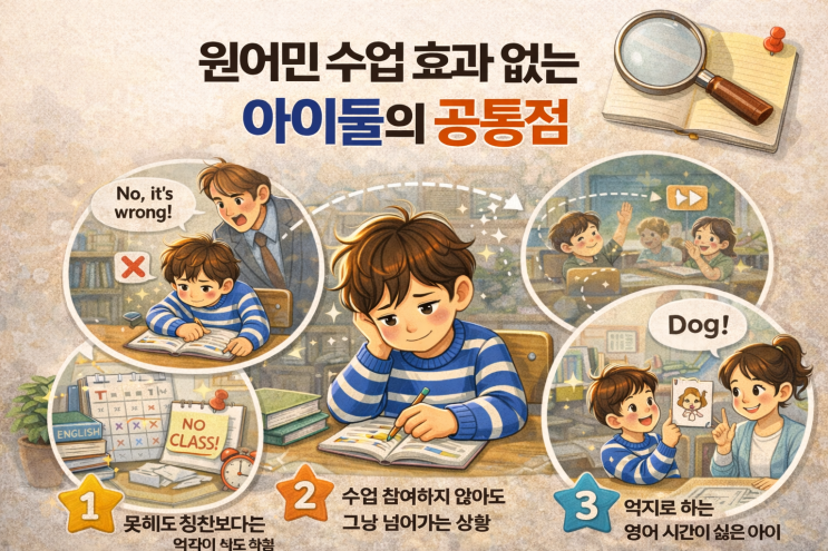 원어민 수업 효과 없는 아이들의 공통점 “원어민 수업인데 왜 변화가 없을까요?” “몇 달을 다녔는데도 말은 그대로예요.” 봉선동에서 초등 영어 상담을 하다 보면 원어민 수업에 대한 기대와 실망을 동시에 안고 오시는 학부모님들을 자주 만나게 됩니다. 원어민 수업 자체가 나쁜 건 아닙니다. 문제는 효과가 안 나는 아이들에게 반복되는 공통점이 있다는 점입니다. 1️⃣ 듣기만 해왔던 아이입니다 원어민 수업 효과가 없는 아이들의 가장 큰 공통점은 영어를 듣기만 해온 경험입니다. 따라 읽기는 했지만 질문에 스스로 답해본 적은 없고 틀릴까 봐 말은 거의 안 해본 경우 이런 아이가 원어민 수업에 들어가면 처음에는 더 조용해집니다....... <img src="https://blogthumb.pstatic.net/MjAyNjAyMjZfNDYg/MDAxNzcyMDkxNDA2ODE2.dGFvvZHKWBjFa81R-yVN3qEoR8M5MFXgbQuOmtgY7Agg.FGUKU-VX6nq-tzyKmiuZMAhDwZnTVi0wipKBN5oKQ_Qg.PNG/ChatGPT_Image_2026%B3%E2_2%BF%F9_26%C0%CF_%BF%C0%C8%C4_04_36_40.png?type=s3" />