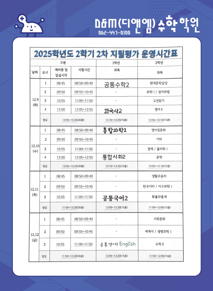 숭일고 2025학년도 1학년 2학기 2차 지필평가 운영시간표