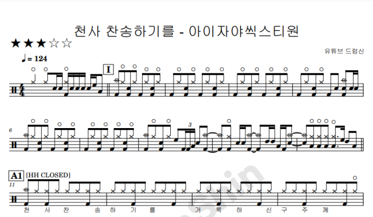 안녕하세요^^ 광주 최고의 시설 & 실용음악 전문학원 "블루실용음악학원" 입니다. "5"만 유튜버 "드럼신"원장님이 언제나 최고의 드럼실력으로 여러분과 함께 합니다 오늘 올려드릴 영상과 악보는 ' 아이자야씩스티원 ' 의 "천사 찬송하기를" 입니다 체계적인 노하우로 드럼 연주에 도움이 될 수있게 직접 정성껏 만들었습니다 드럼반주자 분들께 많은 도움이 되시기를 바랍니당^^ 즐겁게 감상해주셔요^^ 악보 구매 사이트 드럼 & 악기 & 보컬 레슨문의 네이버 톡톡 : 블루실용음악학원 카카오톡 : 블루실용음악학원 인스타그램 : @bluemusic_academy 디엠은 언제나 환영해요^^ *....... <img src="https://blogthumb.pstatic.net/MjAyNTEyMDRfMTYz/MDAxNzY0ODI0ODg5Mjk1.ODroDJxaMYKF_TKbwDN7PhFavW22c26pOLJkTvqUgCEg.LkJXcgHq37mIu1ujJ1ieVnGTlQi7HKCXiJ3viDN71g8g.PNG/%C3%B5%BB%E7_%C2%F9%BC%DB%C7%CF%B1%E2%B8%A6_%BA%ED%B7%CE%B1%D7.png?type=s3" />