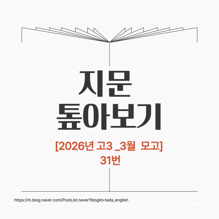 안녕하세요, 로제타스톤 영어교습소 화명 용수초 캠퍼스입니다^^ 지문 톺아보기 이번 지문은 2026년 3월 3학년 모의고사 31번 지문입니다^^ 이 포스팅은 단순히 영어 지문을 해석하거나 문제를 푸는 데서 끝나지 않아요. 학생들이 직접 보고, 스스로 이해할 수 있도록 시각 자료와 실제 생활 속 상황을 연결해 만든 콘텐츠예요. 문장 하나, 그림 하나도 “이걸 보면 아이들이 조금 더 쉽게 이해하겠지?” 하는 마음으로 준비했답니다. 제가 바라는 건 단순한 지식 전달이 아니에요. 아이들 머릿속에 오래오래 남을 수 있는, 깊이 있는 개념을 만들어주는 것이 목표입니다. 정확한 영어 해석은 이미 해설지에 잘 정리되어 있으니, 이곳에서는 내용....... <img src="https://blogthumb.pstatic.net/MjAyNjA0MDNfOTEg/MDAxNzc1MjAzNDkxOTM2.mc7mPLNkZaQXAePueVrbdMeSIv0BKwNUOBkS8Vsnv84g.qprragURcMnAtbo6TARNJFhuTewRJ4qepk2xyIgYemYg.JPEG/%C1%A6%B8%F1%C0%BB-%C0%D4%B7%C2%C7%D8%C1%D6%BC%BC%BF%E4_-005_%2824%29.jpg?type=s3" />