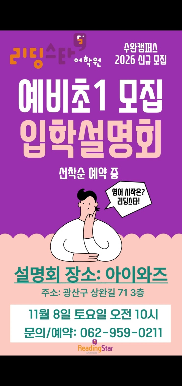 안녕하세요. 리딩스타어학원 수완캠퍼스입니다. 리딩스타는 국제표준(Global Standard) 영어독서 기반으로 1년에 미국 1학년씩의 영어문해력 성장을 목표로 국내입시를 넘어서 영어를 자신의 Life-Skill로 갖추는 것을 교육 목표로 삼고 있습니다. 지난 11월 8일(토), 리딩스타 수완캠퍼스에서는 조금 특별한 자리가 마련되었어요. 바로 2026년 예비초1 및 겨울학기 신규 학생을 위한 학부모 설명회! 이번 설명회는 학원 내부가 아닌 외부 행사장에서 진행돼 조금 더 넓고 쾌적한 환경에서 학부모님들을 만날 수 있었답니다. 설명회 소식은 인스타 광고와 상담 안내를 통해 전달되었고, 예상보다 훨씬 많은 관심을 훨씬 많은 관심을 보내주셨어요....... <img src="https://blogthumb.pstatic.net/MjAyNTEyMDRfMjIz/MDAxNzY0ODA3MzI4NTcw.Ejv6rEjkoGf5EbsjCVeeEv5XbHoz8XH-gRCfRpjvUfMg.47ULdtWlI8AwGHYBqnT3px27u5Vj6PSTV-YCqurH1Lwg.JPEG/900%A3%DFScreenshot%A3%DF20251029%A3%DF091643%A3%DFGallery.jpg?type=s3" />