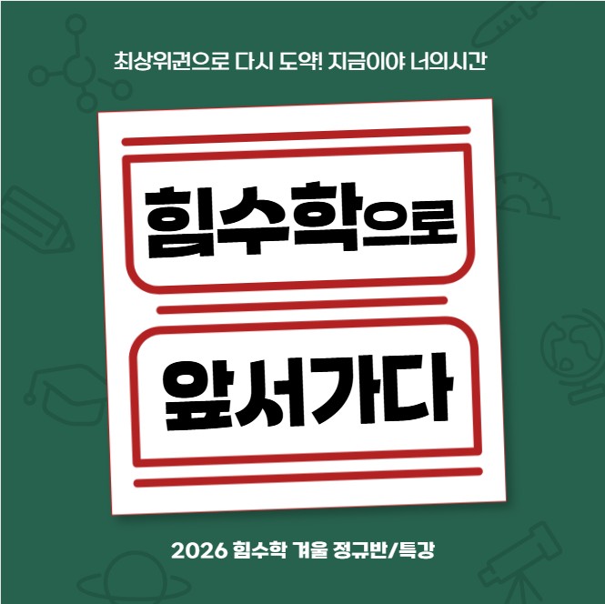 2026년 1월 겨울학기 입반테스트가 시작되었습니다. 진단테스트를 통해 수학이라는 큰 단원 중 학습이 끊겨있는 일부 구간을 찾아내어 취약개념을 집중적으로 관리하고 문제에 적용할 수 있는 힘을 길러줍니다. 힘수학 고등부 진단테스트는 고등수학의 기초가 되는 개념을 탄탄히 다진 후 새로운 상위 개념과도 연결시킬 수 있는 힘을 길러주는 것이 최종 목표입니다. 중3 친구들은 벌써 기말고사가 다 끝나고 방학까지 남은 시간이 정말 중요한 시간입니다. 힘수학은 예비 고1 학생들을 위해 12월은 중등수학 총정리 과정을 진행합니다. 1차 개강: 12월 중 상시 개강 2차 개강: 1월 12일(월),13일(화) <img src="https://blogthumb.pstatic.net/MjAyNTEyMDZfNzUg/MDAxNzY0OTkyNzU0MjE3.UUdkanNN1ZvgKzBKpzjpa27dNydglTCn7ngA1Tl2hKYg.LpFbUkA4UI4ry6J4kd9hWcLIoJHs9yDKQnhrf9xmc2Ag.JPEG/%C4%AB%B5%E5%B4%BA%BD%BA1.JPG?type=s3" />