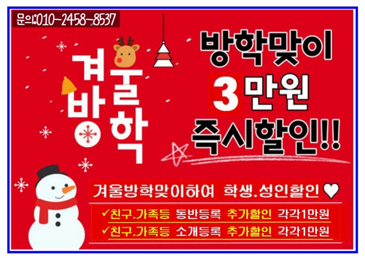 겨울방학 추가할인 겨울방학을 맞이하여 할인에 이어 추가할인을 하오니 많이많이 이용하세요. 동록하시면 즉시3만원할인 친구나 가족등 동반등록시 각각1만원추가 할인 친구나 가족등 소개등록시에도 각각1만원할인 해드립니다. 학생이나 성인 누구나 가능합니다. 추운날씨에 따뜻한 독서실에서 나의미래를 키워 나가시면 어떨까요? 여러분과 함께동반자가 되겠습니다. 가오독서실 <img src="https://blogthumb.pstatic.net/MjAyNTExMjlfMzcg/MDAxNzY0Mzc1OTgzMTc5.TaU6ASsKUhr-Pn0sXOF9mCWxSsVIanLcrcL9pFd3mIAg.rOJ0sbRIkbboy1_CdDdqWWC_fThNzVXezkm2P3OZx00g.JPEG/%C3%DF%B0%A1%C7%D2%C0%CE001.jpg?type=s3" />