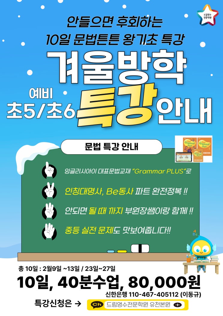 안들으면 후회하는 10일 문법튼튼 왕기초 특강을 개설하였습니다. 초5, 초6의 영어교과서에는 이제 슬슬 문법적 내용이 등장하기 시작합니다. 충~ 분히 우리 드림둥이 아이들은 잉글리시아이의 교재에서 배우고 있지만!!! 이제는 배웠던 단어들이 문법용어가 무엇인지, 그리고 문장에서 어떻게 쓰이는지를 배우는 특강을 준비하였습니다. 그것은 바로바로 잉글리시아이 그래머대표교재 "베이직 그래머 플러스" 입니다. 모든 책이 그렇듯 1권이 제일 중요한 내용을 담고 있습니다. 그래서 꼭 이번 겨울방학동안에 ☝️제대로 ✌️깊이있게 중등문제까지 알려주고 싶었습니다!! 누구에게요? 우리 예비초5, 예비초6학년들이요!! 누구....... <img src="https://blogthumb.pstatic.net/MjAyNjAxMjFfNzgg/MDAxNzY4OTgzODM4ODE4.4NfVJSV253RpJcCIG2ffknH_z4pF8SzTeXh1qneqyI0g.wJ_SGRf2LjrdpcKovP_qHxNrzGz72ykJMK_jL5ISl8Eg.JPEG/001.jpg?type=s3" />
