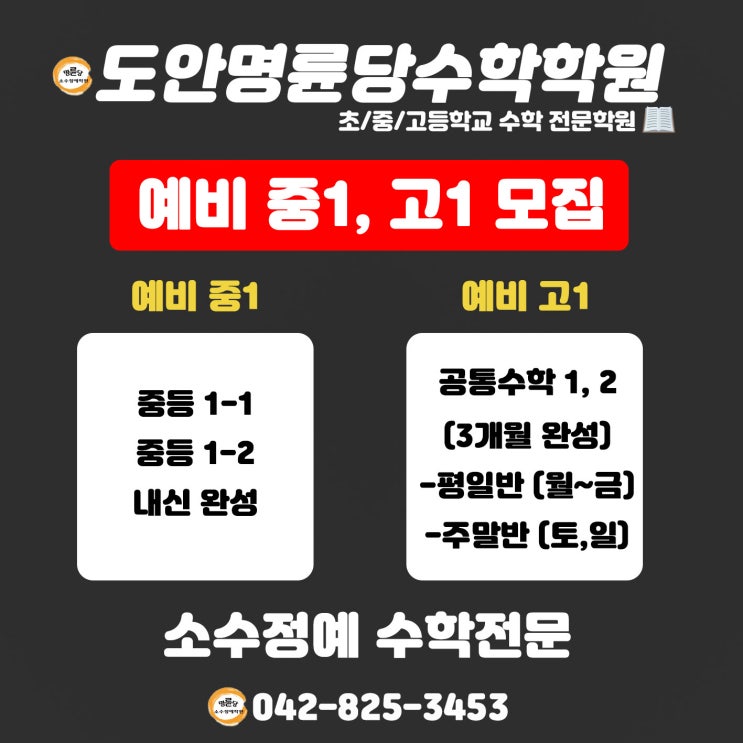 안녕하세요~ 도안명륜당 수학학원 입니다! 예비 중1, 고1 학생들을 모집합니다~ 예비 중1 중등1-1 중등1-2 예비 고1 공통수학1, 2 (3개월 완성) -평일반(월~금) -주말반(토,일) ※자세한 문의 사항은 042-825-3453 로 전화 부탁드립니다※ <img src="https://blogthumb.pstatic.net/MjAyNTExMTJfMTcw/MDAxNzYyOTI3ODY2ODk0.d1QazjmDMkZUsFW4BF9-JpEpNshEHJC7_NuMFhVeeTog.mrUm5xAR6pJly2Z7y-c2zR3LosgLfj6Uie_ImBPKyMIg.JPEG/000000000.jpg?type=s3" />