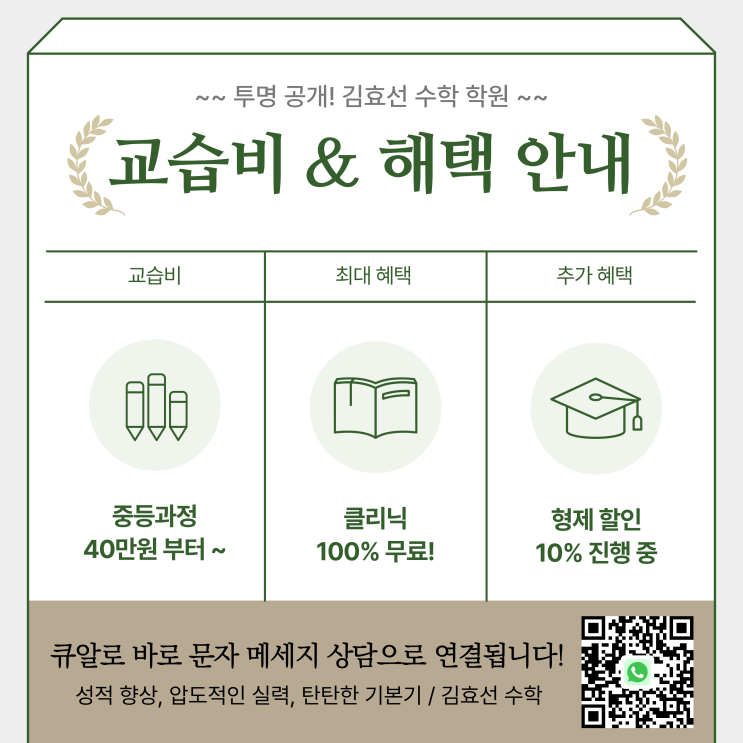 안녕하세요, 김효선 수학 입니다 ~ 학부모님들께 늘 믿임을 드리고 싶은 마음으로 저희 학원의 모든 정보를 투명하게 공개합니다!!! 궁금하셨던 교습비와 과정별 수강료 그리고 형제 할인 같은 혜택까지! 한눈에 보기 쉽게 정리했습니다. 등록 전에 편안하게 확인해보세요! 김효선 수학은 언제나 열린 마음으로 소통하겠습니다. 1. 교습 과정 및 수강료 (회차기준) 저희 김효선 수학은 학생들의 학년 및 학습 단계에 맞춰 최적화된 커리큘럼을 제공하며 회차별 교습비는 다음과 같습니다. (중등12회, 고등 8회 기준) 선택과목 인원이 3명 미만일 시 개강이 안 될 수 있습니다. 2.클리닉 및 보충 학습 3. 특별 혜택 형제 / 자매 할인 동생 수강료....... <img src="https://blogthumb.pstatic.net/MjAyNTExMjNfMTQ0/MDAxNzYzODk0OTc0Nzk1.Tne3-J-0HGHUTArMU6ARIMnmX0ay2nXm26hSPQcqKGwg.icYh02hivgqEnH99Fft8EmWH0rtXhrK0rK9cqIZnIT0g.PNG/%C1%A6%B8%F1%C0%BB_%C0%D4%B7%C2%C7%D8%C1%D6%BC%BC%BF%E4..png?type=s3" />