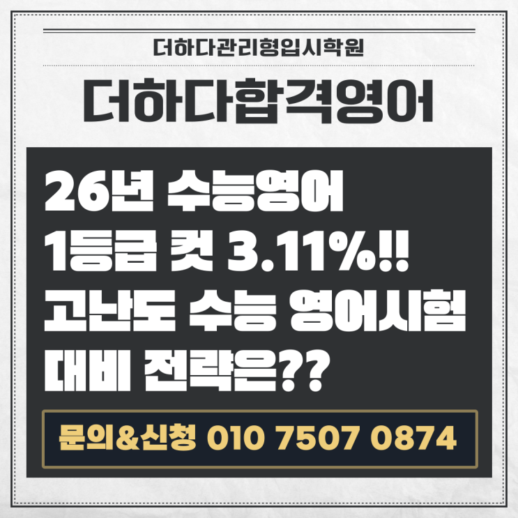 대전둔산동, 더하다관리형입시학원, 26년 수능영어 1등급 컷 3.11%!! 고난도 수능 영어시험 대비 전략은??