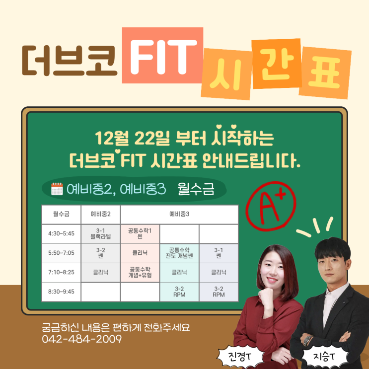 #개념반 #심화반 #개강 #신입생모집 #신규 #재원 #상담은 #042-484-2009 #환영합니다❤️ 안녕하세요, 더브코핏학원입니다 2025년 12월 22일 (월) 부터 한 단계 더 업그레이드된 새 학원 시간표가 적용됩니다. 학생들의 학습 효율을 높이기 위해 수업 구성과 시간에 알찬 변동을 담았습니다. 아래 내용을 꼭 확인해 주세요! 변경 적용일 • 2025년 12월 22일(월)부터 주요 변경 사항 • 수업 조정 • 반별 수업 변동 • 교재 변동 상세 시간표 첨부된 이미지/파일을 확인해 주세요. 변경된 시간표로 한층 더 알찬 수업을 진행하겠습니다. 궁금한 점이 있다면 언제든지 문의 부탁드립니다! 감사합니다 <img src="https://blogthumb.pstatic.net/MjAyNTEyMDZfMTk5/MDAxNzY0OTk3NTQxNDU2.bdlyhY0IC5BpZKMiUTy45sc1vJuyQuplKhJop_TIWiEg.GPxNAgc-Y9lB7WP8Shl_e-4qunWc-sOFBW5kAOsUCRog.PNG/12%BF%F922%C0%CF%B0%B3%B0%AD%BD%C3%B0%A3%C7%A5_%281%29.png?type=s3" />