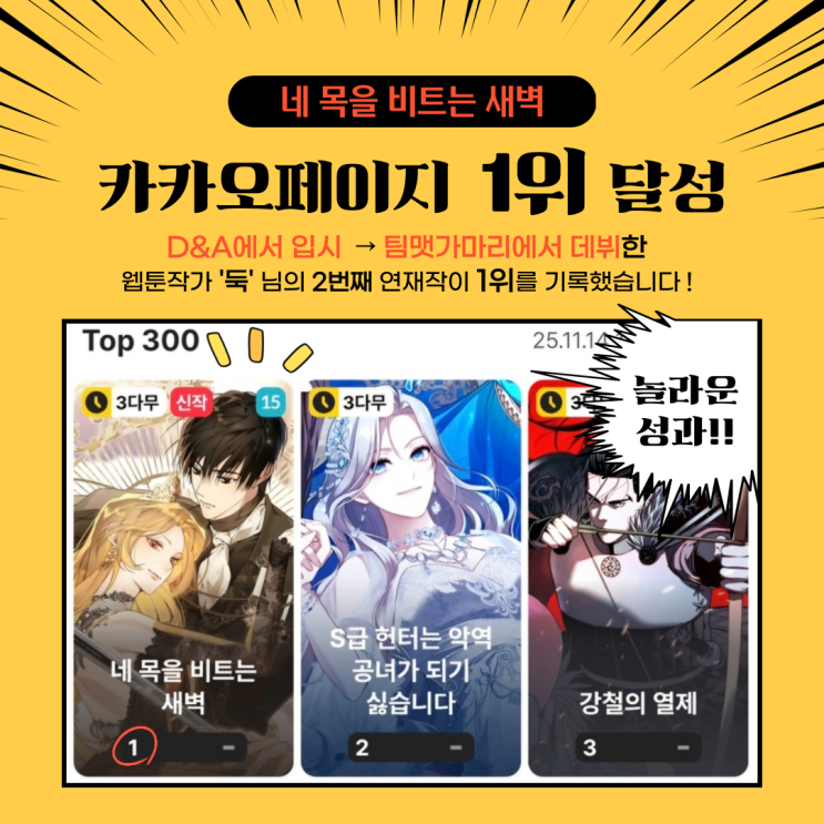 [대전 D&A만화 입시/웹툰학원] 웹툰 [네 목을 비트는 새벽] 카카오페이지 1위 달성!!