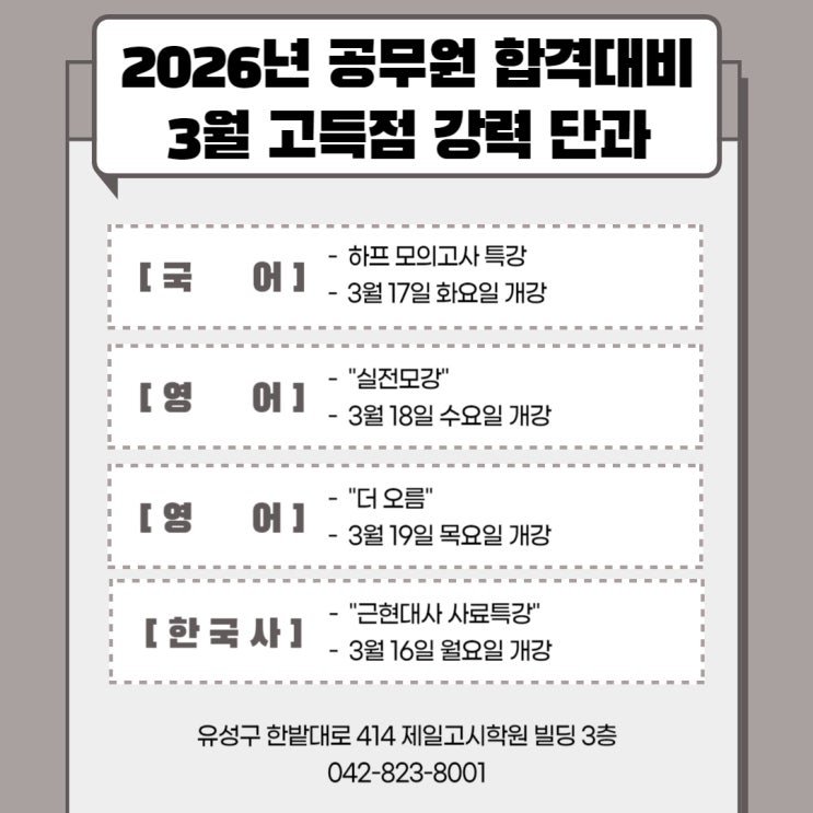 안녕하세요 제일고시학원 본점 (충대앞) 입니다. 오늘은 26년도 공무원을 준비하는분이라면 남들과는 다른 만점에 가까운 점수를 받기위한 고득점 단과 특강 안내입니다! 26년도 국가직, 지방직, 교육청, 군무원 대비 2026년 대비 고득점 강력 단과 3월 개강예정입니다. 고득점 강력단과반을 수강을 해야하는 학생들은 공부를 하다보면 60~70점즈음에 도달하면 항상 벽에 부딪치게 되는 경우가 많습니다. 제일고시학원에서는 공시 각 과목별 완강, 테마 특강으로 단기 성적향상 완성의 중요한 터닝포인트를 만듭니다. 강력단과는 각 과목별 전 범위 주요 핵심 및 쟁점이론을 깊이있고 집중적으로 학습하여 고난도 학습으로의 발전과 경쟁력 강화....... <img src="https://blogthumb.pstatic.net/MjAyNjAyMjZfMTgw/MDAxNzcyMDY1NzA2Njg5.JmqyjiPZzjc5VUoU1H9k3Ngq584aF-4w_EBGrghUjI4g.WPnWNxvqF36xz0WIGd4cf5HF1YeAX0kTJK6YFtjdtYYg.JPEG/%C1%A6%B8%F1%C0%BB_%C0%D4%B7%C2%C7%D8%C1%D6%BC%BC%BF%E4_-001_%283%29.jpg?type=s3" />