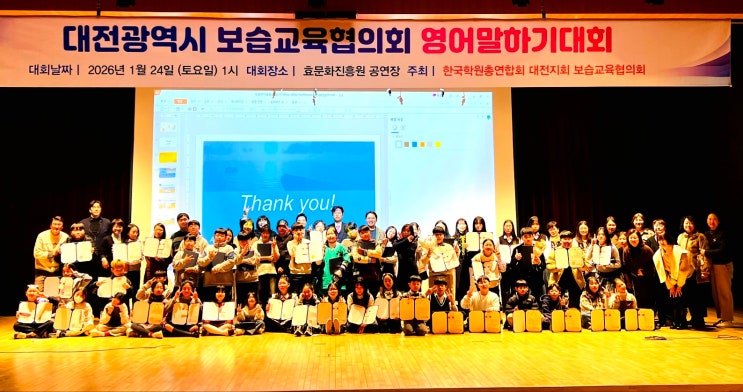 제1회 대전보습교육협의회 영어말하기대회 – 아이들의 자신감이 피어난 날 지난 1월 24일, 효문화진흥원에서 뜻깊은 행사가 열렸습니다. 바로 **‘제1회 대전보습교육협의회 영어말하기대회’**입니다. 이번 대회는 대전보습교육협의회가 주최하고, 지역 내 보습학원과 초·중등 학생들이 함께 참여한 첫 공식 영어 말하기 축제였습니다. 영어 실력보다 ‘자신감’에 초점을 맞춘 무대 이번 대회는 단순히 영어 실력을 평가하는 자리가 아니었습니다. 아이들이 영어를 통해 자신의 생각을 표현하고, 세상과 소통하는 힘을 기르는 경험을 하게 하는 것이 가장 큰 목표였지요. 대전보습교육협의회 김용호 회장은 “이 대회는 경쟁이 아니....... <img src="https://blogthumb.pstatic.net/MjAyNjAxMjZfODIg/MDAxNzY5NDAzOTYxNjY2.M8wpfBj3w5ZoMyxlifC9OVaPi3PZCrR83KQv4F1I2EIg.ZcavuCKaQEXbzdLIVqQoodZpDv5PRXKx0nJvcA_5vNcg.JPEG/KakaoTalk_20260126_133401687.jpg?type=s3" />