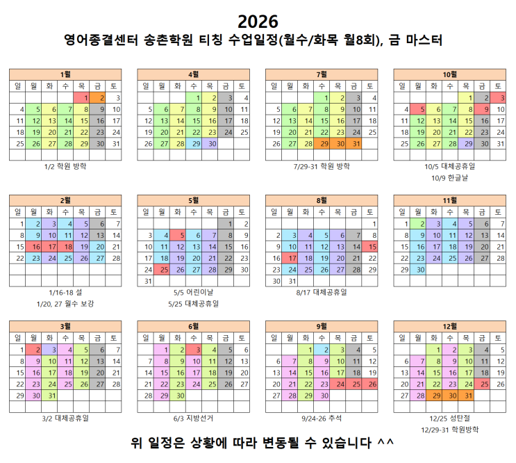 안녕하세요 영어종결센타 송촌학원입니다. 늘 저희 학원을 믿고 함께해 주시는 학부모님들께 감사드립니다. 아이들의 한 해 학습 계획을 세우시는 데 도움이 되실 수 있도록 연간 학원 일정표를 준비해 공유드립니다. 아래에 첨부된 사진에는 ✔ 학기 중 수업 일정 ✔ 휴원일 및 공휴일 ✔ 주요 학습 일정 등이 정리되어 있으니 한 번씩 편하게 확인해 주세요. ️ 2026년 수업 운영 안내 아이들의 꾸준한 학습을 위해 항상 애써주시는 학부모님들께 다시 한번 감사드리며, 궁금하신 점이나 상담이 필요하실 경우 언제든지 편하게 연락 주세요. 앞으로도 아이들이 즐겁고 안정적으로 공부할 수 있는 학원이 되도록 최선을 다하겠습니다 ?....... <img src="https://blogthumb.pstatic.net/MjAyNjAxMThfMTI4/MDAxNzY4NzE0MDQ4OTIz.HJ__IXF1hPExCLLKdKorg4Buho7MtG04HHLFnfv3DFcg.TZUNXQim-VbfMj2WmUlMrhtZhPwN3cwJ6dnu3FuFW_Qg.PNG/2026_%BF%B5%BE%EE%C1%BE%B0%E1%BC%BE%C5%CD_%BC%DB%C3%CC%C7%D0%BF%F8_%BF%AC%B0%A3%C0%CF%C1%A4.png?type=s3" />