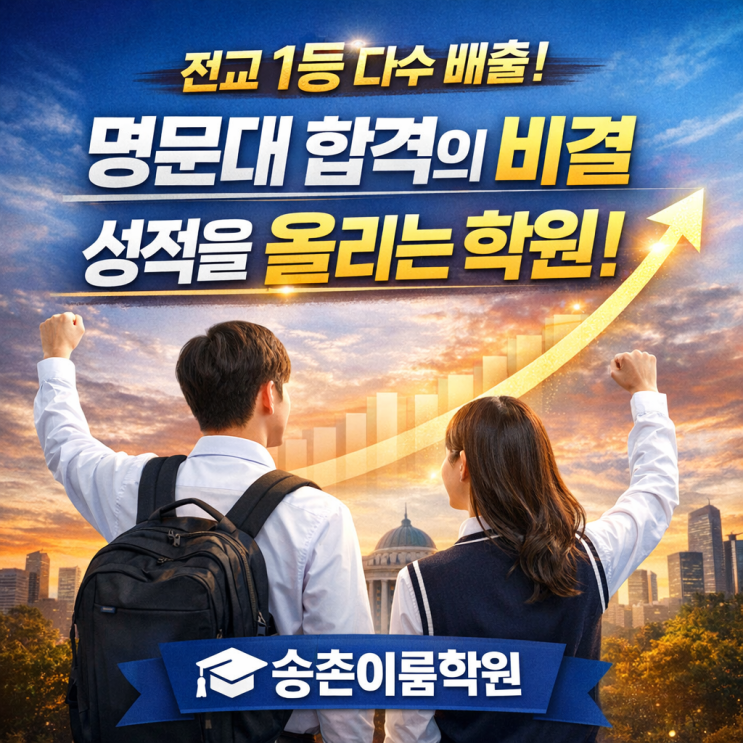 노력은 학생이! 방향은 송촌이룸학원이! 안녕하세요. 대전 송촌동에서 중·고등학생의 내신과 수능을 책임지고 있는 송촌이룸학원입니다. 학원을 선택하실 때 학부모님들께서 가장 중요하게 보시는 것은 화려한 말이 아니라 지속적으로 검증된 결과일 것입니다. 송촌이룸학원은 한 학기, 한 시험의 성과가 아닌 여러 해에 걸쳐 누적된 성적 변화와 입결로 학부모님들의 믿음을 받아왔습니다. 2025년 2학기 주요 대학 합격 성과 2025년 2학기에도 송촌이룸학원 재원생들은 다음과 같은 대학 합격 성과를 만들어냈습니다. 서울대학교 연세대학교 고려대학교 성균관대학교 서강대학교 한양대학교 충남대학교 외 주요 대학 다수 이 결과는 단순히....... <img src="https://blogthumb.pstatic.net/MjAyNjAxMjZfODkg/MDAxNzY5NDM1NTczMTU0.m28q1IvWT01ulM0CwI-PY_a5wXfpJqEItyeIPsGNsw8g.NvUcFbf14UTYuwOiB0_-H5CI5xz31-SHj3VHdXhB-PYg.PNG/ChatGPT_Image_2026%B3%E2_1%BF%F9_26%C0%CF_%BF%C0%C8%C4_09_42_40.png?type=s3" />