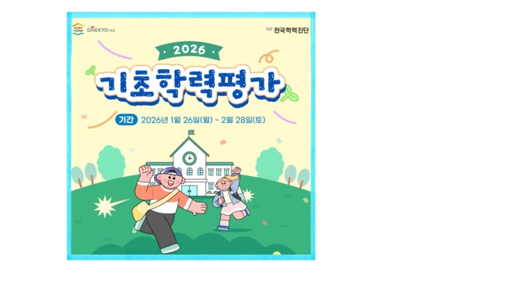 안녕하세요! 눈높이 용전학원 입니다! 다가오는 새 학년, 새 학기! 우리 아이 실력이 어디쯤인지 궁금하다면? 눈높이 전국학력진단 기초학력평가에 응시해보세요! 새 학년을 준비하는 눈높이 전국학력진단 기초학력평가 ✍기초학력 진단평가란? ✍기초학력평가 안내 ✅응시 기간 2026년 1월 26일(월) ~ 2025년 2월 28일(토) ✅응시 대상 (2026년 3월 기준 초등 2학년~ 중등 1학년) ✅응시 방법 PC 및 태블릿을 통한 온라인 평가 ✅응시 과목 / 응시 시간 초등 2~3 학년 : 읽기, 쓰기, 셈하기 / 과목 당 25문항, 40분 초등 4학년 ~ 예비 중학교 1학년 : 국, 수, 영, 사, 과 / 과목 당 30문항, 40분 ✅결과 및 오답 확인 응시 직후 개인별 결과 Rep....... <img src="https://blogthumb.pstatic.net/MjAyNjAxMjhfNjQg/MDAxNzY5NTg3NDM4MzQ2.RfqXNA4fKwqXHiPLya2od1aGlkpXBHZk6OY1_gPheDAg.RrbW6fUB1b9D6_1glf-GQiEJnTDvTQWcpWT8IMoKSJwg.JPEG/1%BF%F9.jpg?type=s3" />