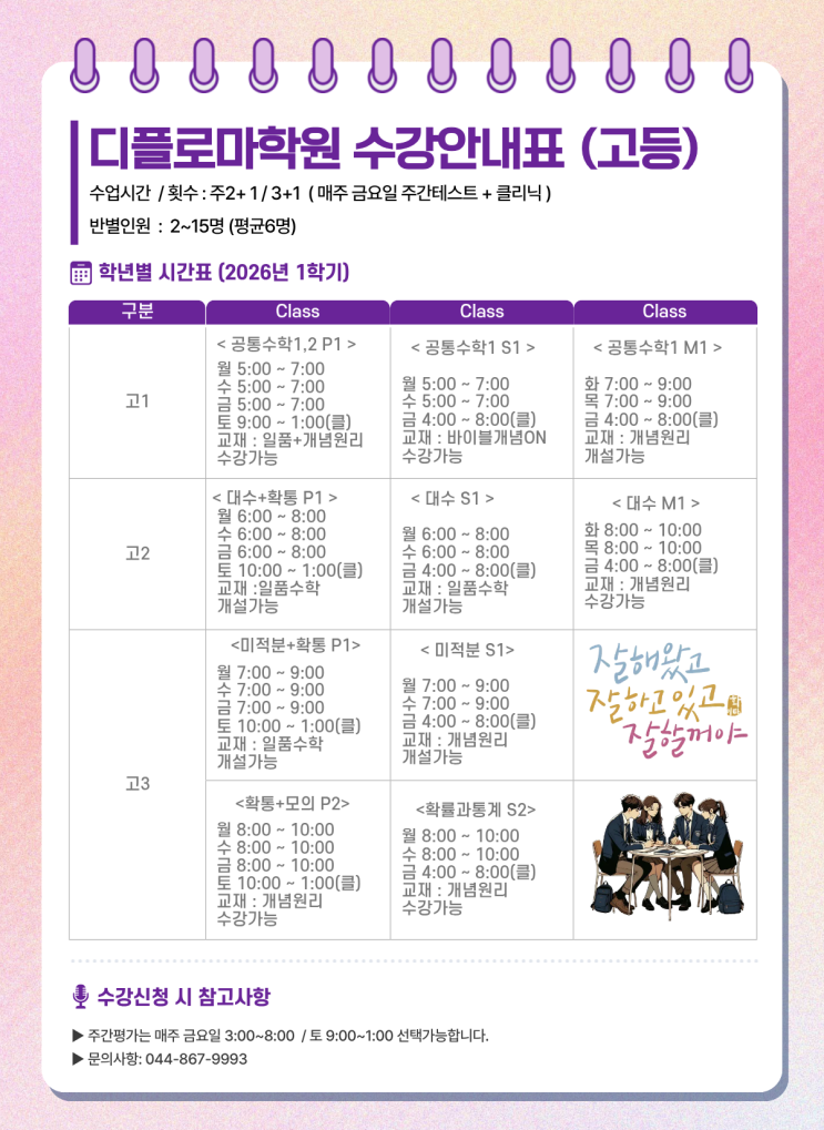 디플로마학원 새롬센터는 원장·부원장이 직접 수업하고 직접 관리합니다. 반을 크게 돌리기보다, 소수정예로 오답·약점·루틴까지 끝까지 잡는 방식으로 운영합니다. 2026 1학기 수강안내표(중등/고등)는 학년별·레벨별로 구성되어 있습니다. 새학기 개강 개강일: 3월 2일(월) 정규 수업: 월·수·금 / 회당 120분 디플로마의 운영 방식 1) 진단부터 하고, 반배정은 그 다음입니다 레벨테스트 → 결과 상담 → 개별지도 1~2회 → 반 편성 2) 테스트와 클리닉은 ‘옵션’이 아니라 ‘기본 구성’입니다 수학은 수업만으로 올라가지 않습니다. 테스트 → 오답정리 → 취약 단원 보완(클리닉) → 재확인 3) 소수정예 정원 6명 정원을 크게 잡지 않습니....... <img src="https://blogthumb.pstatic.net/MjAyNjAyMDRfMTEy/MDAxNzcwMTkxNzg2MTUw.583hbElCtBdsrQsf1zcbLfoQybo2uGB6EfkdMA0BQiIg.sCKbzcSsvixAXJ6rBa4qFCnecHOxs7Kg0Vu5rZyO6Kog.PNG/%B5%F0%C7%C3%B7%CE%B8%B6%C7%D0%BF%F8_%BC%F6%B0%AD%BE%C8%B3%BB%C7%A5%28%B0%ED%B5%EE%29.png?type=s3" />