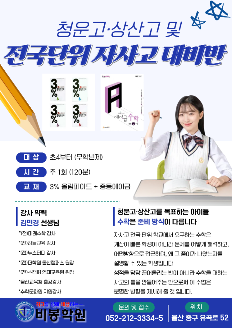 요즘 초등 고학년 학부모님들과 상담을 하다 보면 청운고, 상산고를 포함한 전국 단위 자사고에 대한 관심이 점점 더 빠른 시기부터 시작되고 있다는 것을 느끼게 됩니다. 예전에는 중학생이 되어서야 고민하던 학교를 이제는 초등 시기부터 염두에 두고 준비하려는 학부모님들이 많아졌습니다. 하지만 목표 학교를 먼저 정했다고 해서 준비가 저절로 되는 것은 아닙니다. 특히 수학은 ⛔ 단기간 선행 ⛔ 문제 풀이 양 늘리기 만으로는 결코 따라갈 수 없는 과목입니다. 자사고와 전국 단위 학교에서 요구하는 수학은 계산이 빠른 학생이 아니라 문제를 어떻게 해석하고 어떤 방향으로 접근하며 왜 그 풀이가 나왔는지를 설명할 수....... <img src="https://blogthumb.pstatic.net/MjAyNTEyMzBfNjcg/MDAxNzY3MDc0Njc2MTQ5.TcJJ4ME0_FGd04RqPCyEiNkcATfpy7hg8XuqQ3ez4dMg.U0sc3SEAA5kw6UgiemfwvJzoLO84Mmqs5cAcYi8eTX0g.PNG/KakaoTalk_20251230_145329124_03.png?type=s3" />