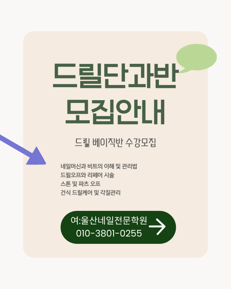 안녕하세요^0^ #울산네일전문학원 #여_울산네일전문학원 보미쌤입니다 ㅎㅎㅎ 저희 학원은 창업전문학원으로, 창업을 꿈꾸시는 분들이 많이 찾아와주시는데요! 네일샵 실무에서 드릴은 선택이 아니라 거의 필수죠? 젤오프 시간 단축은 물론이고, 건식 케어, 리페어, 파츠 오프, 굳은살 관리까지 작업 퀄리티를 좌우하는 핵심 기술이에요. 하지만 드릴은 "빨리 돌리면 된다"가 아니라 각도, 압, 속도(RPM), 비트 선택이 정확해야 손상 없이 안전하게 할 수 있어요. 그래서 여:울산네일전문학원에서는 실무에 바로 적용할 수 있도록 #드릴단과반 을 운영하고 있답니다XD 드릴 단과반, 이런 분들에게 추천해요 · 젤오프 시간이 오래 걸려....... <img src="https://blogthumb.pstatic.net/MjAyNjAyMTNfOTMg/MDAxNzcwOTc2OTg2ODEw.RlRw4ojzGoZRCs9Upx3che9dQGmcIb_at2ghhc1F2pkg.wgeo0lMig7DFSNAnMiiE_a0hQKSaaF-p4Ch4ZpUX3QYg.PNG/%BA%A3%C0%CC%C1%F6_%B1%F2%B2%FB%C7%D1_%BD%C5%B1%D4_%BD%BA%C5%CD%B5%F0_%C8%B8%BF%F8_%B8%F0%C1%FD_%BE%C8%B3%BB_%C0%CE%BD%BA%C5%B8%B1%D7%B7%A5_%C6%F7%BD%BA%C6%AE.png?type=s3" />