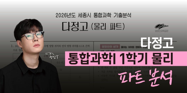 안녕하세요. 너희가 꽃이다 학원입니다. 오늘은 엄정인T 과학공장 연구실에서 세종시 통합과학 기출을 어떻게 분석하는지 알려드리려 합니다. 이 게시물을 시작으로 다정고, 새롬고, 대성고 최근 기출 중 각 파트별(물/화/생/지) 주요 문항들의 분석서와 이의 대비 방안들을 간략하게 설명드리려 합니다. ↓ ↓ 순으로 구성됩니다. 다정고 통합과학 1학기 물리 파트입니다. • 다정고 통합과학 물리파트는 시중 문제집에서는 볼 수 없는 해석들이 필요합니다. • 고2 물리학 수준의 일부 개념 및 용어에 대한 학습, 그리고 “평균”의 해석 및 이용이 필요합니다. • 특정 용어가 등장했을 때 바로 튀어나올 수 있는 일반화된 풀이의 훈련이 필요....... <img src="https://blogthumb.pstatic.net/MjAyNjAxMTJfMTEz/MDAxNzY4MTk1NDY0NTU4.tqVUTcBCMlzmDkLUTg-1itTo2j350-TZG5CaWDccLaQg.U5qnek2hGYx3UgZ0oSQit_V6shbFby2fX4jx8mBJCwAg.JPEG/%C4%AB%C4%AB%BF%C0%C5%E5%C3%A4%B3%CE.jpg?type=s3" />