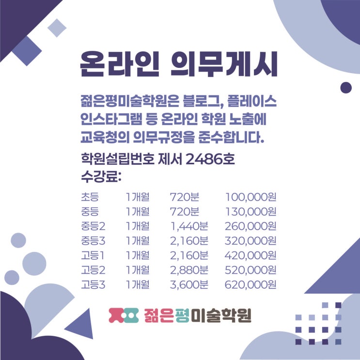 [세종 미술학원] 세종 젊은평 미술학원 수강료 안내