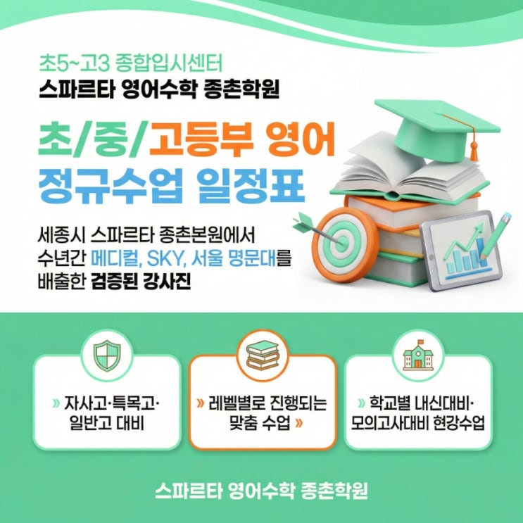 [스파르타 영어] 정규수업 일정표 스파르타의 현강은 레벨 테스트 결과에 기반한 객관적 반 편성으로 운영됩니다. 학생의 실력을 실질적으로 끌어올리는 단계별 구조를 확인하세요. 학년별 영어 현강 커리큘럼 스파르타 영어는 기초부터 수능 실전까지, 단계별로 탄탄한 실력을 구축합니다. 스파르타는 단순히 진도만 빠르게 나가는 학원이 아닙니다! 학생, 한 명 한 명의 실력과 학교별 내신 환경을 정밀하게 분석하여 가장 현실적이고 효과적인 학습 전략을 제시합니다. 특히 대학 진학에 성공한 선배들이 평균 5년 이상 장기 재원하며 증명해온 스파르타의 영어 커리큘럼은 초등부터 고등까지 흔들림 없는 실력을 만들어냅니다. 결과로 증....... <img src="https://blogthumb.pstatic.net/MjAyNjAyMjhfMjU1/MDAxNzcyMjQwOTk0OTQz.OpZLbwB6hv_UhPOPHbGAWaSCMw3BS8SYdorjUCSTuvwg.WdLY5qBQyYZ_MozMSpZTTn5amAaozk1MxL_hz9FFCiIg.JPEG/900%A3%DFAIDrawing%A3%DF260226%A3%DF0eee8702%A3%AD0a8b%A3%AD47e8%A3%ADb902%A3%AD778abefb4fc9%A3%DF0%A3%DFMiriCanvas.jpg?type=s3" />