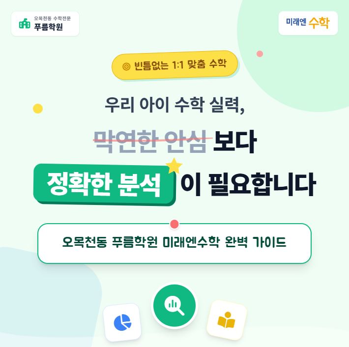 안녕하세요! 아이들의 마음을 먼저 읽고 실력을 탄탄하게 채워주는 오목천동 푸름학원입니다. 새 학기가 시작되고 한 달 남짓 우리 아이 수학 공부 어떻게 하고 있나요? "학습지 잘 풀어요", "학원 잘 다니고 있어요"라는 막연한 안심만으로는 부족합니다. 수학은 이전 단계를 모르면 다음 단계로 나갈 수 없는 계통 학문이기 때문에 작은 구멍 하나가 학년이 올라갈수록 거대한 벽이 되어 나타나기 때문이죠. 저희 푸름학원은 대한민국 교육 1위 기업 미래엔의 노하우가 집약된 미래엔수학 시스템을 도입하여 오목천동 아이들에게 빈틈없는 1:1 맞춤 수학을 선물하고 있습니다. 푸름학원이 수학을 가르치는 구체적인 방식을....... <img src="https://blogthumb.pstatic.net/MjAyNjAzMjdfMjcg/MDAxNzc0NTc4MDEzNzY2.WFFaDCHrMniPopgMa7t0D6hnnW8Sgoj-m5-i6jQBOcIg.9oaMTRVOGQ3jCFM-mRPR_-q9fF37Ulbsr57aigCYD4Eg.JPEG/12412412412.JPG?type=s3" />