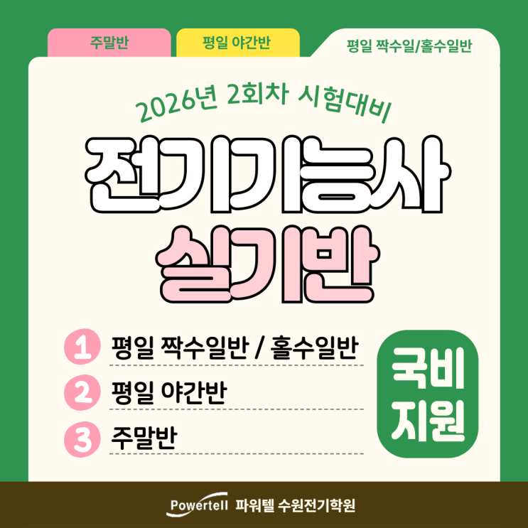 안녕하세요, 파워텔 수원전기학원입니다. 어제부터 2026년 제2회 전기기능사 필기시험이 시작되었죠!! 실기반 모집 블로그를 읽고 계시는 수험생 여러분들! 필기합격을 축하드립니다. 이제 최종관문인 실기 시험만을 앞두고 있는 상황일텐데요! 필기시험이 객관식으로 번호를 고르는 시험이었다면, 실기시험은 작업형 시험이죠! 직접 제어판을 구성하는 등 실제 회로를 완성해야 하는데요, 이론에 익숙하더라도 직접 몸으로 익혀본 적이 없다면 제한시간 내에 완성하기 힘든 시험이죠. 특히 전기를 전기기능사 필기 시험으로 처음 접하신 분들이라면, 어디서부터 어떻게 준비해야할 지 고민이 많으실 것 같습니다. 하지만 지금 이 블로그를 보고....... <img src="https://blogthumb.pstatic.net/MjAyNjA0MDZfMjMw/MDAxNzc1NDU4MjYxNDk1.OITGcuyzSshQ2v3mu1UOEku_aBFXOuovRHh2mxbvCzQg.y1gB3Exy-77IkoE0prmCtrLiWoBZnuSuSTEOoP-Mv9Eg.PNG/013.png?type=s3" />