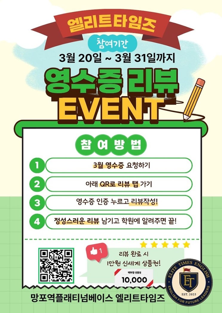 안녕하세요 3월을 맞이하여 감사한 마음을 담아 영수증 리뷰 이벤트를 진행합니다 이벤트 기간 3월 20일 ~ 3월 31일까지 참여 방법 (완전 간단!) 1️⃣ 3월 영수증 요청하기 2️⃣ 아래 QR코드로 리뷰 페이지 접속 3️⃣ 영수증 인증 후 리뷰 작성 4️⃣ 정성껏 리뷰 남기고 학원에 알려주면 완료! 이벤트 혜택 ⭐ 리뷰 작성만 해도! 1만원 신세계 상품권 증정 작은 리뷰 하나가 큰 힘이 됩니다! 아이들의 성장과 학원의 발전에 도움이 되는 소중한 의견 많이 남겨주세요 앞으로도 더 좋은 수업과 관리로 보답하겠습니다! 망포역플래티넘베이스 엘리트타임즈학원 <img src="https://blogthumb.pstatic.net/MjAyNjAzMThfMjYy/MDAxNzczODEwOTIwNzAz.KZXva_oi5ep12BvS41XRUHRrcp0IWE4x4VrDe6V0vLYg.q1-dTBL-RxC2nbjmzflccrCayUdafitl-TEiD6tY4DIg.JPEG/1773810877134.jpg?type=s3" />