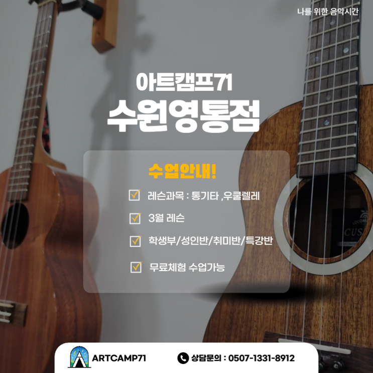 새학기 준비와 새로운 일상 속에서도 기타,우쿨렐레를 놓지 않고 한 달 동안 꾸준히 수업에 참여해주신 회원분들께 진심으로 감사의 마음을 전합니다. 다가오는 3월에는 더 따뜻해진 계절만큼 아트캠프71과 함께하는 시간이 한층 더 즐거워지길 바랍니다. 앞으로의 걸음도 함께 응원하며, 늘 같은 자리에서 기다리고 있겠습니다. 3월도 활기차게 시작하며 수업안내 드립니다. 3월 수업안내 월요일 레슨 3월9일/ 16일 / 23일/ 30일 화요일 (출강) 화요일 외부출강으로 인해 수원점 레슨은 없습니다. 수요일 레슨 3월 11일 / 18일/ 25일/ 4월1일(수업대체) 목요일 레슨 3월5일/ 12일 / 19일/ 26일 금요일 레슨 3월6일/ 13일 / 20일/ 27일 토요일 레....... <img src="https://blogthumb.pstatic.net/MjAyNjAyMjVfMTE4/MDAxNzcxOTQ3NDI4MjMy.U0AJV-rk0gIgtvMh54VOrelo2MTsh0Rcj3tMrnKl75Eg.FAT40YKxoToR16DL3PosFTWE1d-_m6-EFq-_Uz_5r0og.PNG/%BC%AD%BF%AC-004.png?type=s3" />